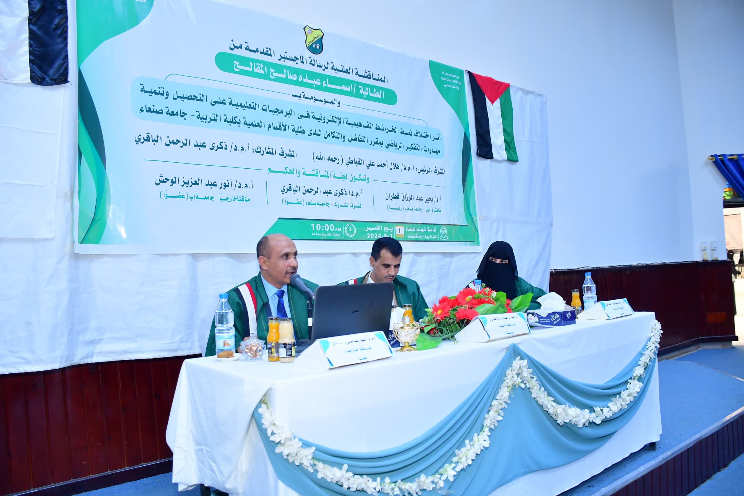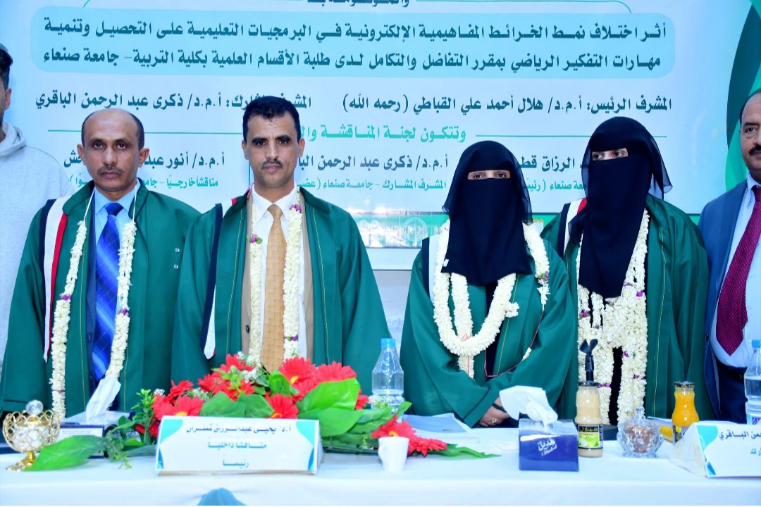 نالت الباحثة/ اسماء عبده صالح المقالح، درجة الماجستير بدرجة 95% بتقدير ممتاز، في قسم (قسم تكنولوجيا التعليم) تخصص (تكنولوجيا التعليم) كلية (التربية) بجامعة صنعاء عن رسالتها الموسومة بــــــ (أثر اختلاف نمط الخرائط المفاهيمية الإلكترونية في البرمجيات التعليمية على التحصيل وتنمية مهارات التفكير الرياضي بمقرر التفاضل والتكامل لدى طلبة الأقسام العلمية بكلية التربية- جامعة صنعاء)، وتكونت لجنة المناقشة والحكم من الأستاذ الدكتور ( ذكرى محمد عبد الرحمن الباقري) مشرفا مشاركًا وعضو اللجنة، والأستاذ الدكتور (يحيى عبد الرزاق قطران) مناقشا داخليا ورئيسا للجنة، والأستاذ المشارك (أنور عبد العزيز الوحش) مناقشا خارجيا عضو اللجنة، وقد هدفت الرسالة إلي معرفة أثر اختلاف نمط الخرائط المفاهيمية الإلكترونية في البرمجيات التعليمية على التحصيل وتنمية مهارات التفكير الرياضي بمقرر التفاضل والتكامل لدى طلبة الأقسام العلمية بكلية التربية- جامعة صنعاء، فيما توصلت الرسالة الى عدد من النتائج منها وجود أثر إيجابي لكل من نمط الخرائط المفاهيمية الإلكترونية الهرمية ونمط الخرائط المفاهيمية الإلكترونية العنكبوتية في البرمجيات التعليمية على تنمية التحصيل، ومهارات التفكير الرياضي ، ولاتوجد فروق بين النمطين على التحصيل وتنمية مهارات التفكير الرياضي . وقدمت الباحثة في رسالتها عدد من التوصيات منها استخدام الخرائط المفاهيمية الإلكترونية في تعليم وتعلم فروع الرياضيات المختلفة، وفي المراحل التعليمية المختلفة، وإعداد طلبة كلية التربية وتأهيلهم . حضر المناقشة عدد من الأكاديميين والباحثين والطلاب والمهتمين وعدد من زملاء الباحثة وأفراد أسرته.