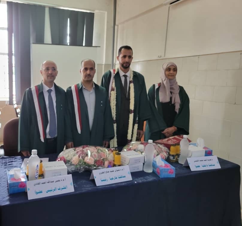 وتكونت لجنة المناقشة والحكم من الاستاذ الدكتور /يحيى عبدالله احمد الهادي مشرفا رئيسا وعضوا للجنة والاستاذه المساعده الدكتوره/ تغريد احمد محمد الكبسي مناقشا داخليا عضوا للجنه والاستاذ المشارك الدكتور /نشوان حميد صالح الطيري مناقشا خارجيا عضو اللجنة وقد