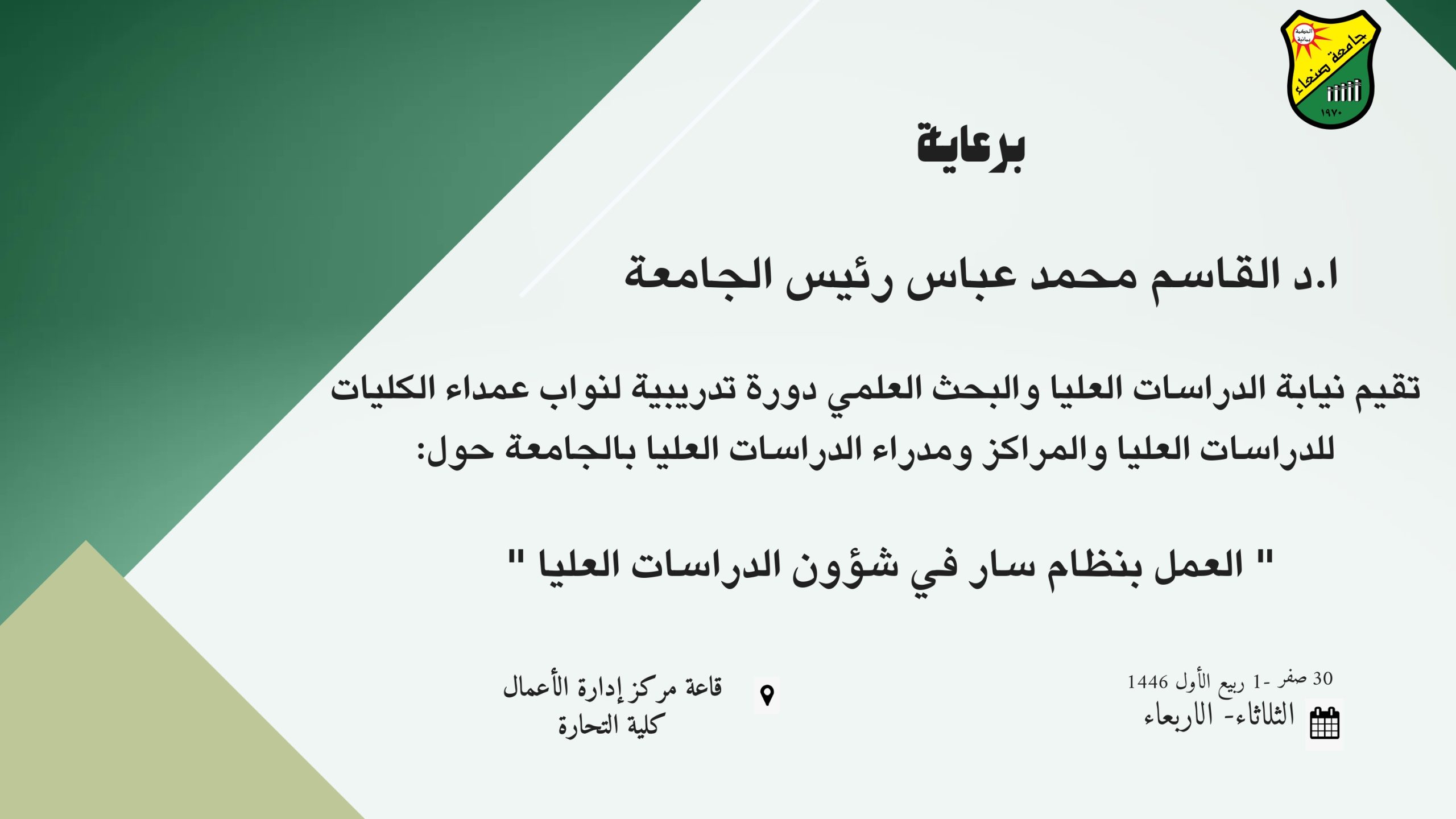 برعاية الأستاذ الدكتور/ القاسم محمد عباس رئيس جامعة صنعاء اختتمت اليوم الأربعاء في قاعة مركز إدارة الأعمال بكلية التجارة والاقتصاد الدورة التدريبية الخاصة بتطبيق العمل بنظام سار في كل اجراءات الدراسات العليا .