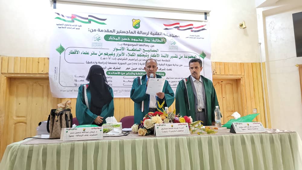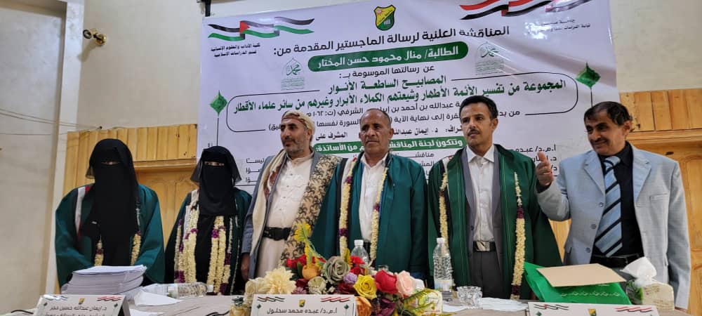 نالت الطالبة /منال محمود حسن المختار درجة الماجستير بدرجة 95 % من قسم (الدراسات الإسلامية) تخصص (تفسير) بكلية (الآداب والعلوم الإنسانية) بجامعة صنعاء
