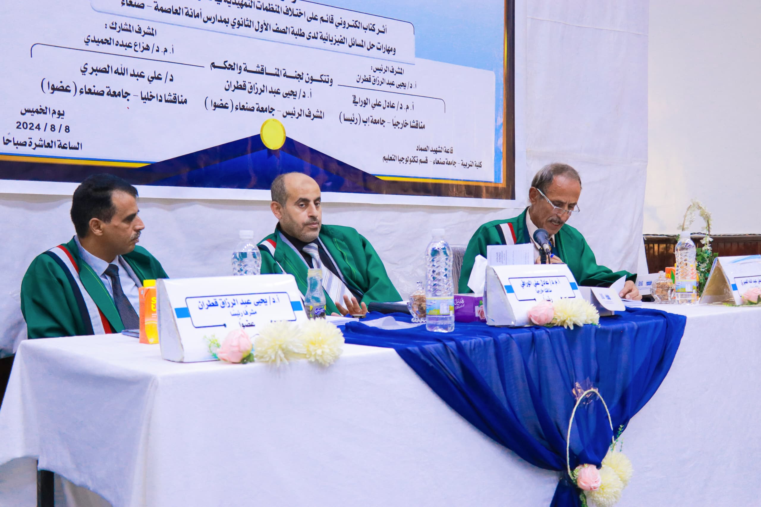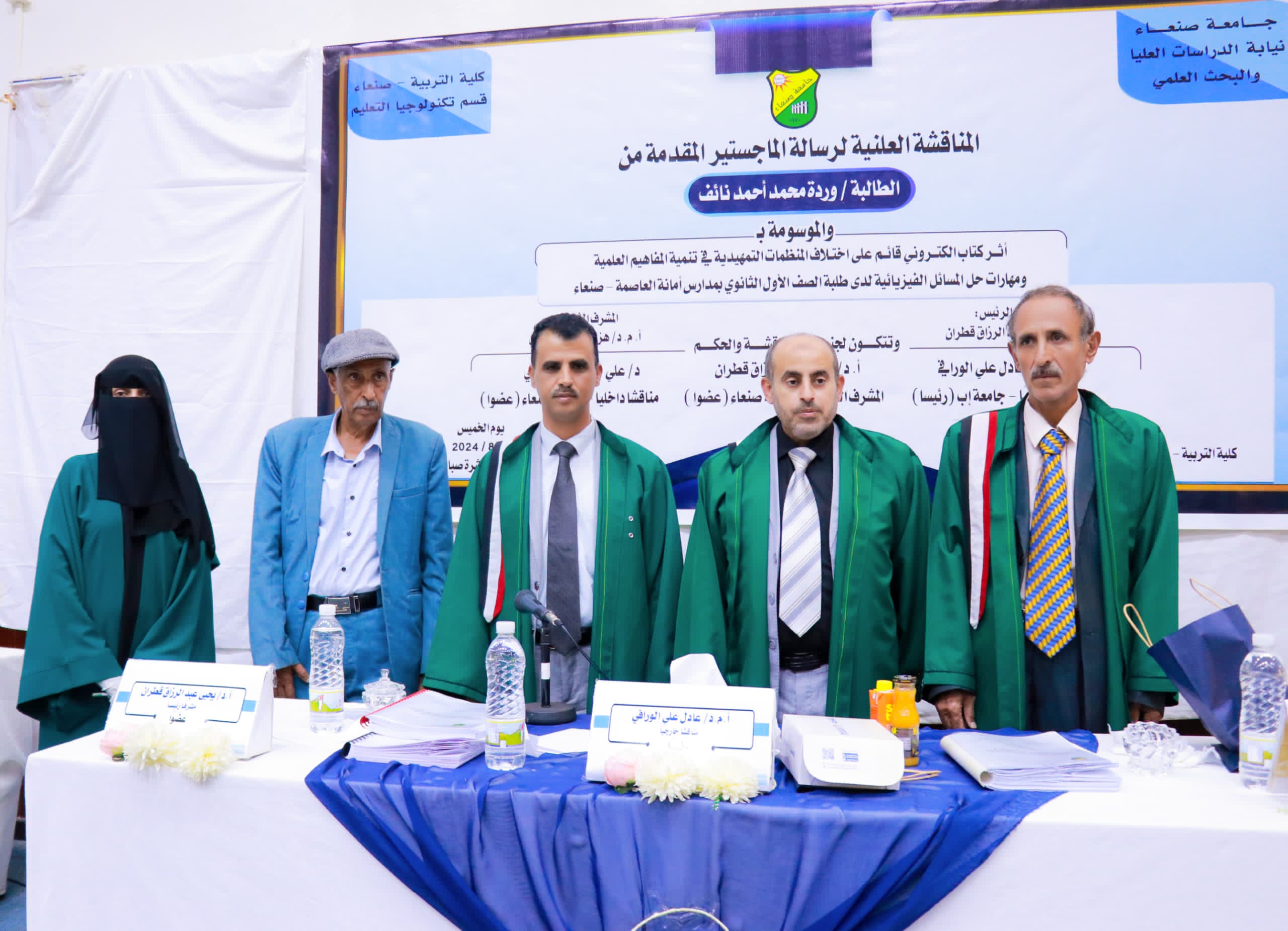 نالت الطالبة /ورده محمد أحمد نائف، درجة الماجستير بدرجة 95 بتقدير ممتاز في قسم (تكنولوجيا التعليم) تخصص (تكنولوجيا التعليم) كلية (التربية) بجامعة صنعاء عن رسالته الموسومة بــــــ( أثر كتاب الكتروني قائم على اختلاف المُنظِمات التمهيدية في تنمية المفاهيم العلمية ومهارات حل المسائل الفيزيائية لدى طلبة الصف الأول الثانوي بمدارس امانة العاصمة- صنعاء) الخميس 1446/2/4الموافق 8 /8/2024م، وتكونت لجنة المناقشة والحكم من الأستاذ الدكتور (يحيى عبدالرزاق قطران) مشرفا رئيسا وعضو اللجنة، والدكتور (على عبدالله الصبري) مناقشا داخليا و عضوًا للجنة، والأستاذ الدكتور(عادل علي الورافي) مناقشا خارجيا ورئيس اللجنة، وقد هدفت الرسالة إلي معرفة أثر كتاب الكتروني قائم على اختلاف المنظمات التمهيدية في تنمية المفاهيم العلمية ومهارات حل المسائل الفيزيائية لدى طلبة الصف الأول الثانوي بمدارس امانة العاصمة- صنعاء، فيما توصلت الرسالة الى عدد من النتائج منها: وجود أثر إيجابي للكتاب الإلكتروني القائم على المُنظِمات التمهيدية (نصية- صوتية) في تنمية المفاهيم العلمية ومهارات حل المسائل الفيزيائية لطلبة الصف الأول الثانوي بمدارس أمانة العاصمة صنعاء، وجود أثر إيجابي للكتاب الإلكتروني القائم على المُنظِمات التمهيدية (صورية- صوتية) في تنمية المفاهيم العلمية ومهارات حل المسائل الفيزيائية لطلبة الصف الأول الثانوي بمدارس أمانة العاصمة صنعاء، عدم وجود اختلاف بين الكتاب الإلكتروني القائم على اختلاف المُنظِمات التمهيدية (نصية- صوتية)، (صورية- صوتية) في تنمية المفاهيم العلمية ومهارات حل المسائل الفيزيائية لطلبة الصف الأول الثانوي بمدارس أمانة العاصمة صنعاء، وقدمت الطالبة في رسالتها عدد من التوصيات منها بالاهتمام بتنمية المفاهيم العلمية ومهارات حل مسائلها في المرحلة الثانوية، وتصميم كتب الكترونية في تدريس المواد العلمية في جميع المراحل الدراسية، حيث تتضمن هذه الكتب نماذج واضحة للمُنظِمات التمهيدية. حضر المناقشة عدد من الأكاديميين والباحثين والطلاب والمهتمين وعدد من زملاء الباحث وأفراد أسرته.