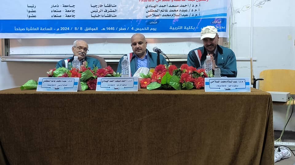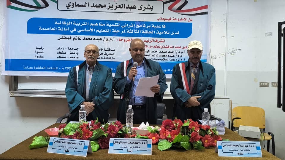 وتكونت لجنة المناقشة والحكم من الأستاذ الدكتور (عبده محمد المطلس) مشرفًا رئيسًا وعضو اللجنة، والأستاذ الدكتور (عبد السلام محمد الصلاحي) مناقشًا داخليًا ورئيسًا للجنة، والأستاذ الدكتور (أحمد مسعد الهادي) مناقشًا خارجيًا وعضو للجنة. وقد هدفت الرسالة إلى معرفة أثر برنامج في تنمية مفاهيم التربية الوقائية لدى تلاميذ الحلقة الثالثة لمرحلة التعليم الأساسي في أمانة العاصمة، فيما توصلت الرسالة إلى عدد من النتائج منها: