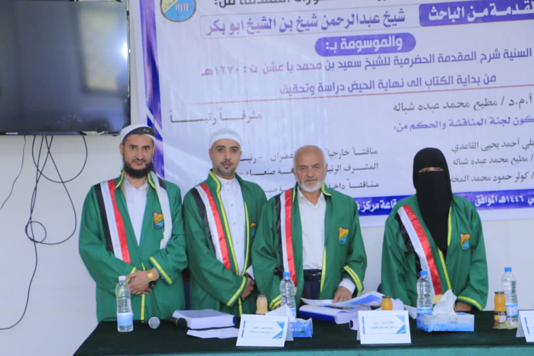 نال الباحث شيخ عبدالرحمن شيخ ابن الشيخ أبوبكر، درجة الدكتوراه في قسم الدراسات الإسلامية تخصص فقه مقارن كلية الآداب والعلوم الإنسانية بجامعة صنعاء، عن الأطروحة الموسومة بـ”المواهب السنيّة شرح المقدمة الحضرمية للشيخ سعيد بن محمد باعشن ت: 1270هـ من بداية الكتاب إلى نهاية الحيض: دراسة وتحقيق”، اليوم الخميس تاريخ هجري 7/4/1446 الموافق 10/10/2024م.
