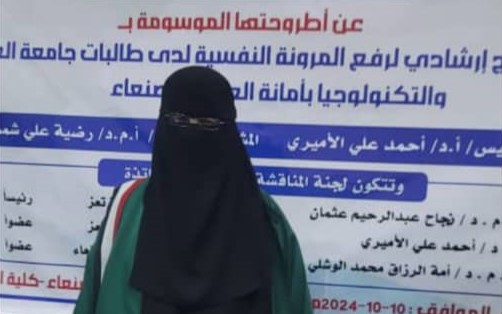 نالت الباحثة أسماء جواد سلام قاسم العزعزي درجة الدكتوراه من قسم (علم النفس التربوي) تخصص (إرشاد نفسي وتربوي) كلية (التربية -صنعاء) بجامعة صنعاء، عن أطروحتها الموسومة بـ”فاعلية برنامج إرشادي لرفع المرونة النفسية لدى طالبات العلوم والتكنولوجيا بأمانة العاصمة صنعاء”، الخميس 7 ربيع الثاني 1446هـ الموافق 10 أكتوبر 2024م.