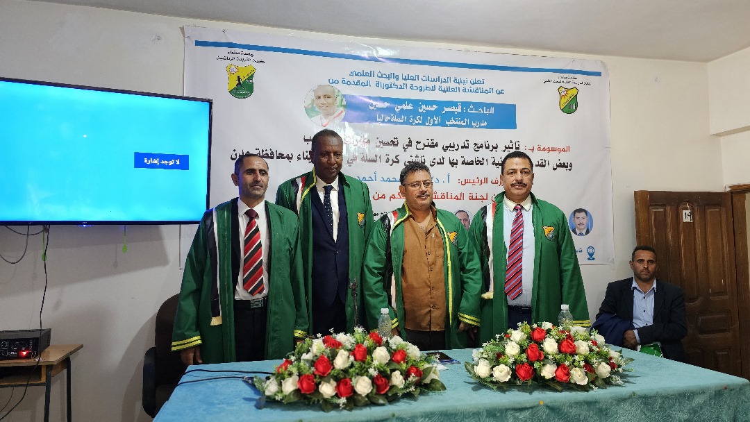 نال باحث الدكتوراه قيصر حسين علمي حسين، درجة الدكتوراه في قسم (التربية الرياضية) تخصص (تربية رياضية) كلية (التربية الرياضية) بجامعة صنعاء، عن أطروحته الموسومة بـ”تأثير برنامج تدريبي مقترح في تحسين مهارات التصويب وبعض القدرات البدنية الخاصة بها لدى ناشئي كرة السلة في نادي الميناء بمحافظة عدن”، اليوم الأربعاء تاريخ 27 ربيع الثاني 1446هـ الموافق 30/10/2024م.