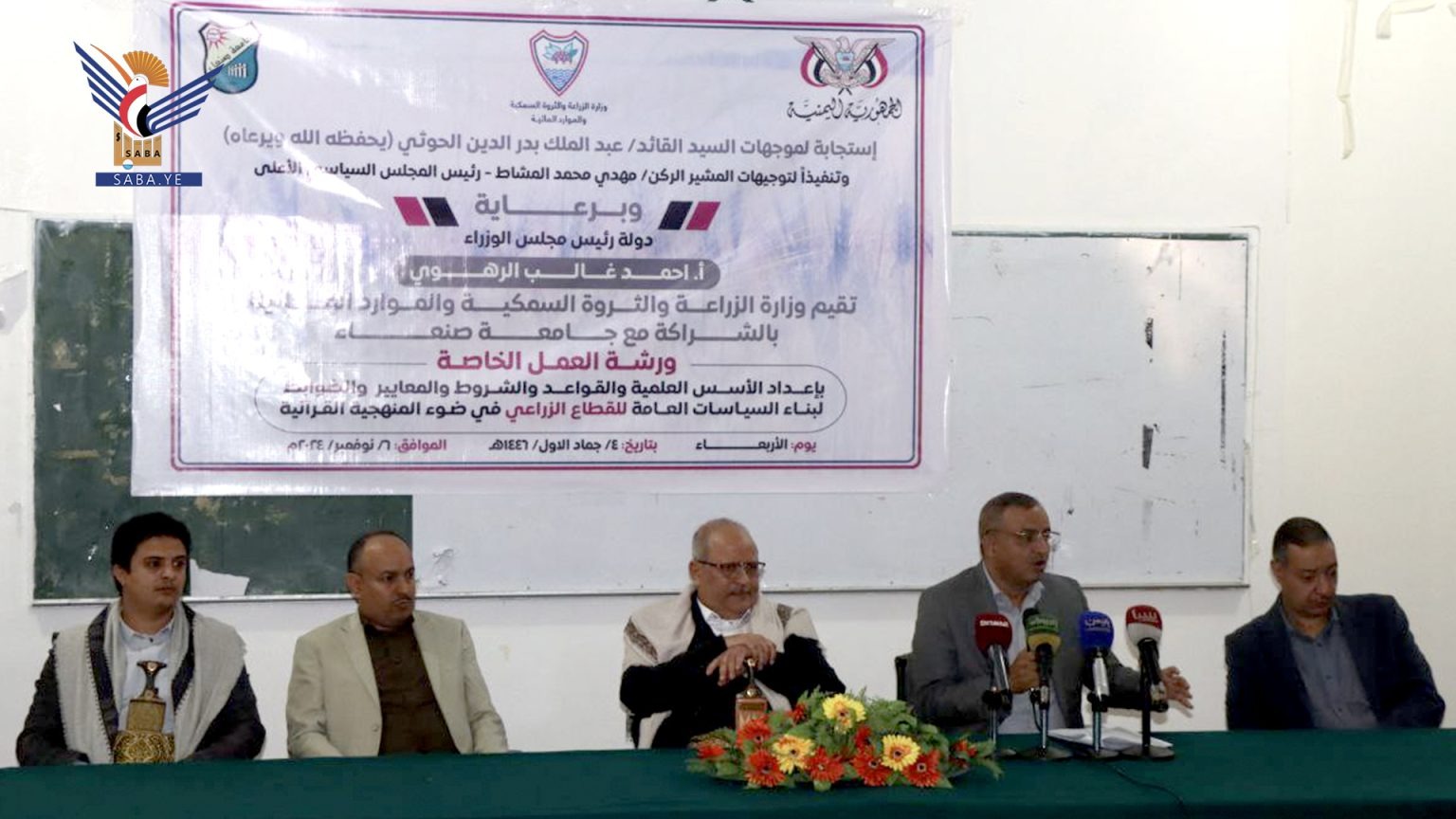 نظمت وزارة الزراعة والثروة السمكية والموارد المائية بالشراكة مع جامعة صنعاء، اليوم، ورشة العمل الخاصة بإعداد الأسس العلمية والقواعد والشروط والمعايير والضوابط لبناء السياسات العامة للقطاع الزراعي في ضوء المنهجية القرآنية.