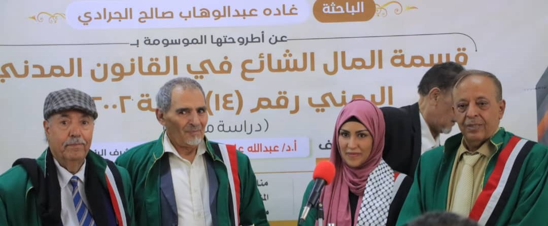 نالت الباحثة غادة عبدالوهاب صالح الجرادي، درجة الدكتوراه من قسم القانون الخاص، تخصص القانون المدني، كلية الشريعة والقانون بجامعة صنعاء، عن أطروحتها الموسومة بـ”قسمة المال الشائع في القانون المدني اليمني رقم 14 لسنة 2002م، الخميس 19 جمادى الأولى 1446هـ الموافق 21 نوفمبر 2024.