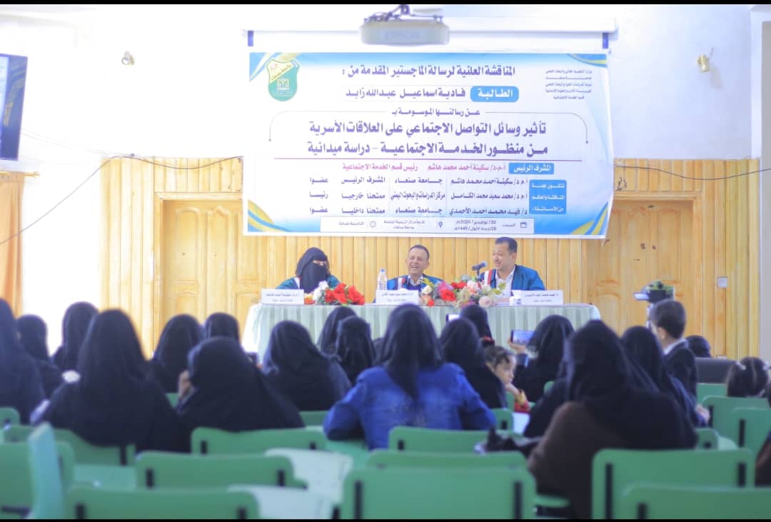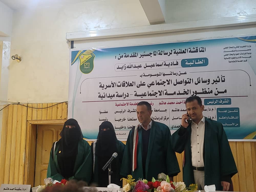 نالت الطالبة فادية إسماعيل عبدالله زايد الماجستير بدرجة 91% بتقدير ممتاز في قسم الخدمة الاجتماعية – تخصص خدمة فرد – كلية الآداب والعلوم الإنسانية بجامعة صنعاء عن رسالتها الموسومة بـ: (تأثير و سائل التواصل الاجتماعي على العلاقات الأسرية من منظور الخدمة الاجتماعية – دراسة ميدانية )