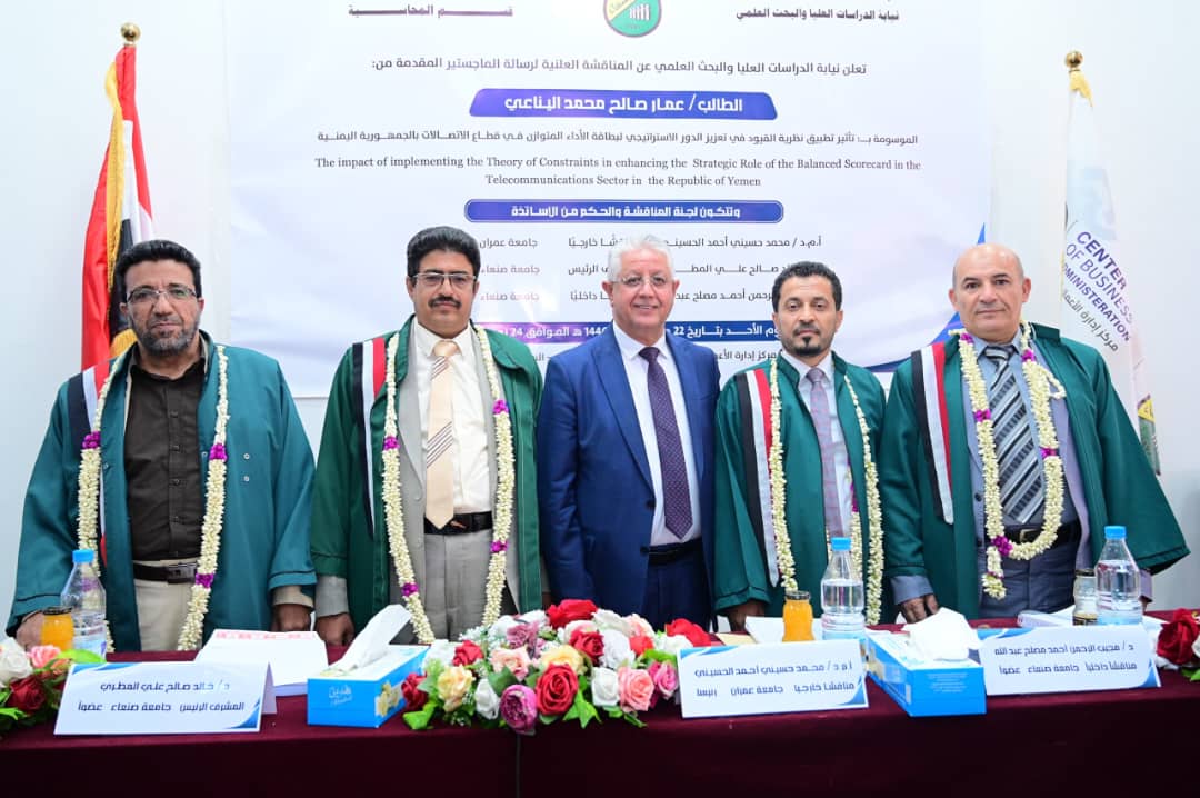 نال الطالب عمار صالح محمد اليناعي- درجة الماجستير بدرجة 95%، بتقدير ممتاز في قسم (المحاسبة) تخصص (محاسبة) كلية (التجارة والاقتصاد) بجامعة صنعاء عن رسالته الموسومة بـ(تأثير تطبيق نظرية القيود في تعزيز الدور الاستراتيجي لبطاقة الأداء المتوازن في قطاع الاتصالات بالجمهورية اليمنية)يوم الأحد 22/05/1446ه الموافق 24/11/2024م، وتكونت لجنة المناقشة والحكم من الأستاذ المشارك (محمد حسيني أحمد الحسينـــــي) مناقشًا خارجيـــــــــًا ورئيسًا للجنة، والدكتور (خالد صالح علي المطــري) مشرفًا رئيسًا وعضو اللجنة، والدكتور (مجيب الرحمن أحمد مصلح عبدالله) مناقشًا داخليًا وعضو اللجنة، وقد هدفت الرسالة إلى التعرف إلى تأثير تطبيق نظرية القيود في تعزيز الدور الاستراتيجي لبطاقة الأداء المتوازن في قطاع الاتصالات بالجمهورية اليمنية.