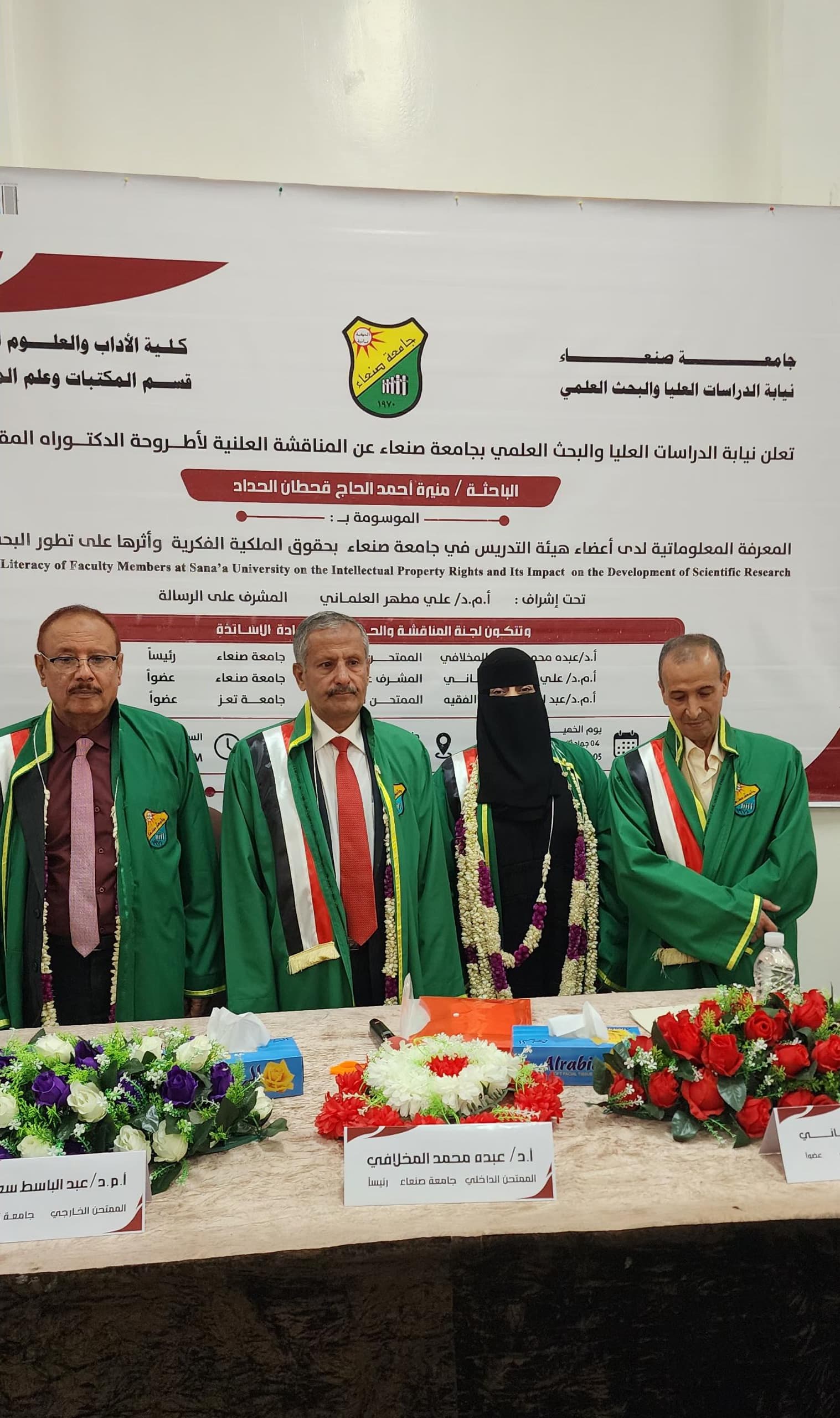نالت الباحثة منيرة أحمد الحاج قحطان الحداد درجة الدكتوراه من قسم المكتبات وعلم المعلومات، تخصص إدارة المعرفة: حقوق الملكية الفكرية، بكلية الآداب والعلوم الإنسانية بجامعة صنعاء، عن أطروحتها الموسومة بـ “المعرفة المعلوماتية لدى أعضاء هيئة التدريس بجامعة صنعاء بحقوق الملكية الفكرية وأثرها على تطور البحث العلمي”، يوم الخميس 4 جمادى الآخرة 1446هـ، الموافق 5/12/2024م.