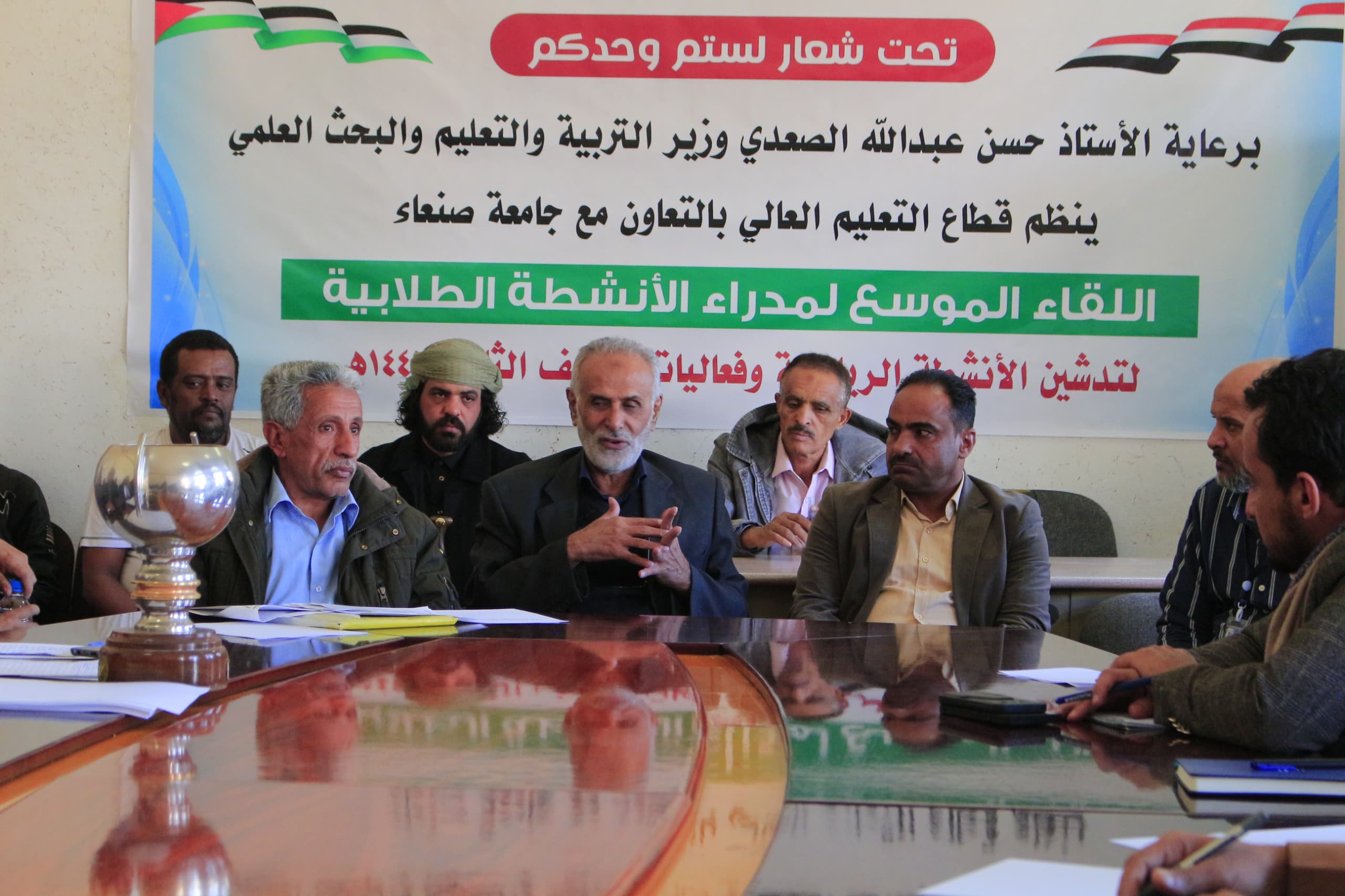 وفي اللقاء أكد نائب رئيس جامعة صنعاء لشؤون الطلاب الدكتور محمد شكري، أهمية دور الأنشطة الطلابية في تحفيز الطلبة على الإبداع والتعلم الذاتي واكتساب المعارف والمهارات المختلفة إلى جانب العلوم التخصصية.