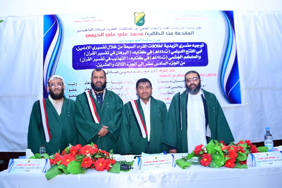 نال الطالب/ محمد علي علي الحيمي درجة الماجستير بامتياز بتقدير 95% يوم الخميس 4- 6ـ 1446هـ. ـ الموافق 5-12- 2024م عن رسالته الموسومة بـ” توجيه مفسري الزيدية لخلافات القُراء السبعة من خلال تفسيري الإمامين إبي الفتح الديلمي (ت:444هـ)’ في كتابيه: البرهان في تفسير القرآن’ والحاكم الجشمي (ت:494هـ) في كتابه التهذيب في تفسير القرآن’ من الجزء السادس عشر إلى الجزء الثالث والعشرين” .
