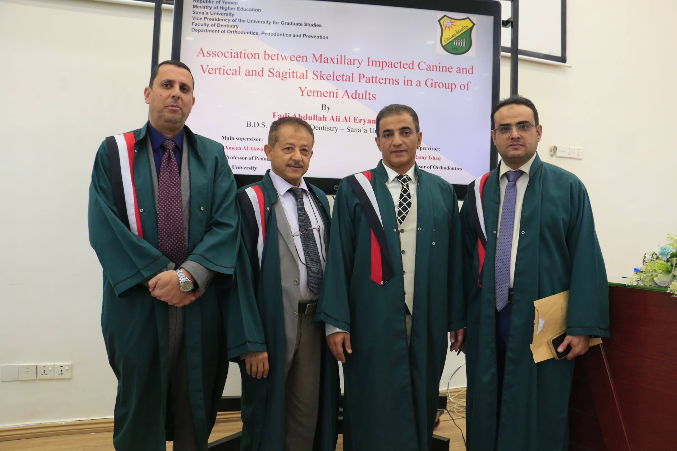 نال الطالب فادي عبدالله علي الارياني درجة الماجستير بتقدير ممتاز في قسم تقويم الاسنان وطب الأسنان الوقائي بكلية طب الأسنان بجامعة صنعاء عن رسالته الموسومة ب( العلاقه بين الأنياب المطمورة بالفك العلوي ونمط الهيكل العظمي في المستويين الرأسي والسهمي عند مجموعة من اليمنيين البالغين) يوم الثلاثاء 9 جمادى الآخرة 1446ه الموافق 10/ 12/ 2024م.