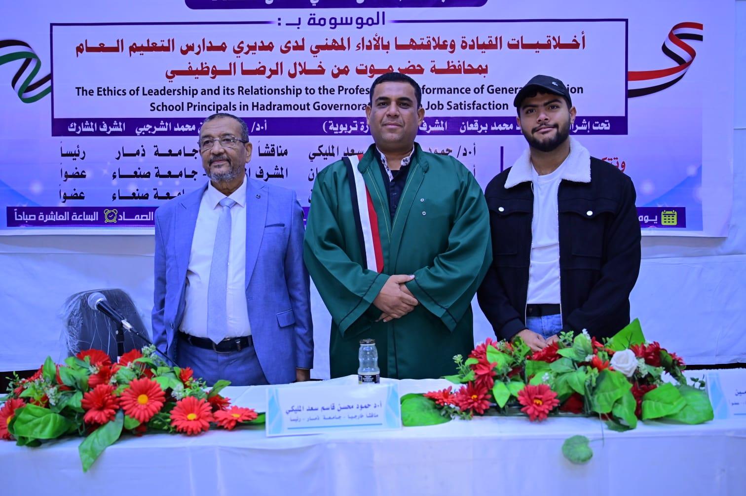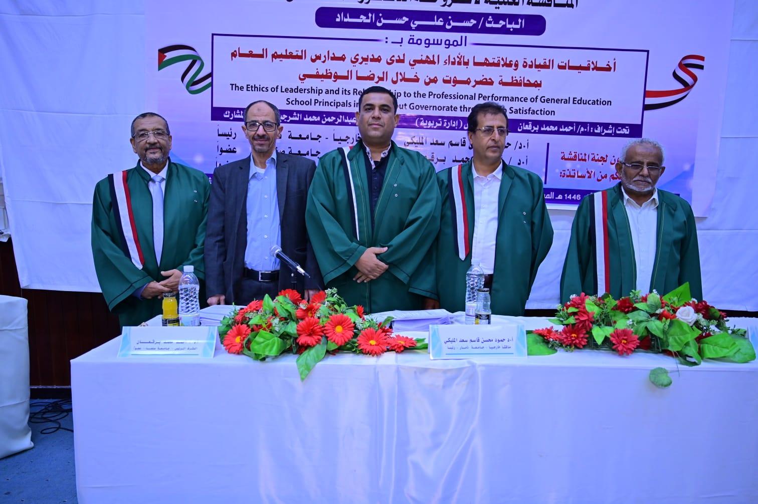 نال الباحث/حسن علي حسن الحداد ، درجة الدكتوراه من قسم الإدارة والتخطيط بكلية التربيه – جامعة صنعاء- عن إطروحته الموسومة بـ( أخلاقيات القيادة وعلاقتها بالأداء المهني لدى مديري مدارس التعليم العام بمحافظة حضرموت من خلال الرضا الوظيفي