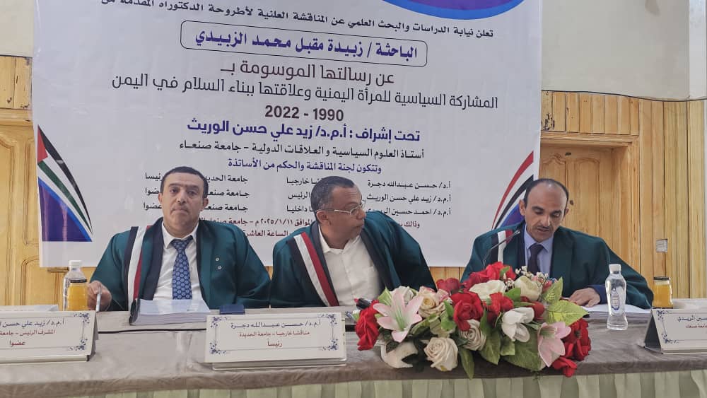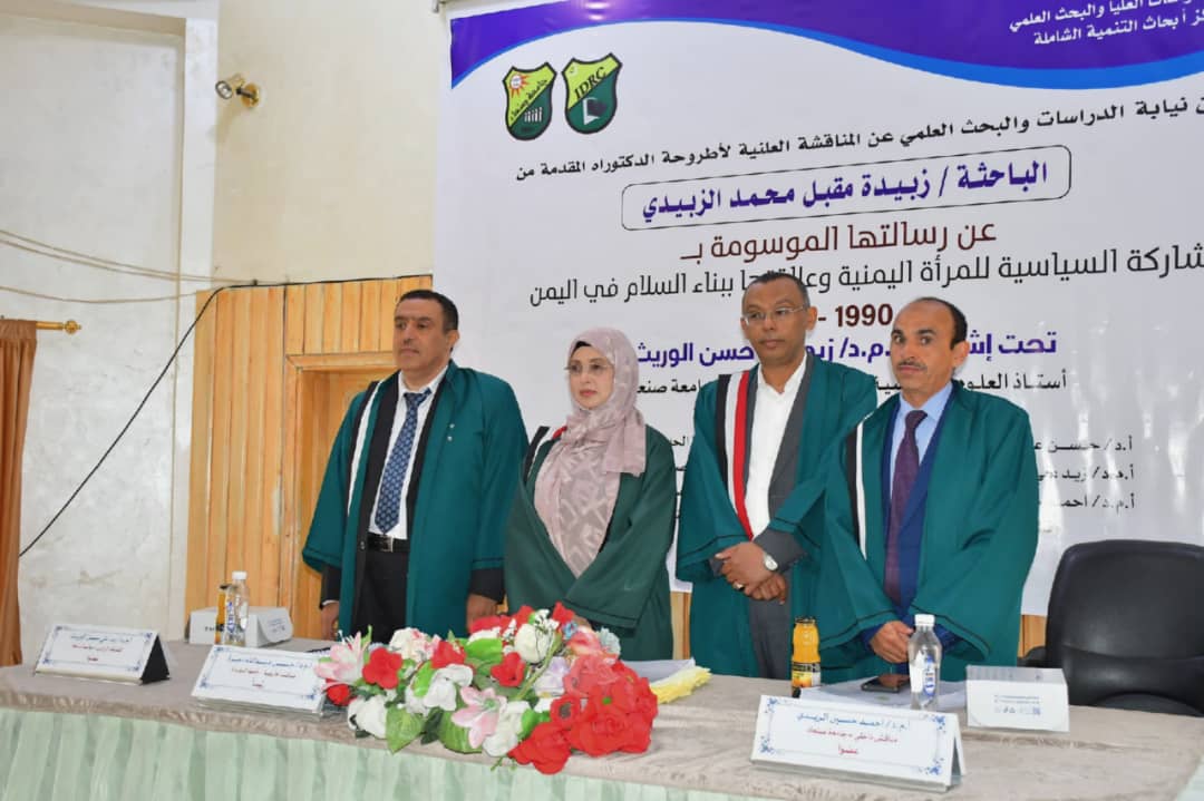 درجة الدكتوراه تخصص “تنمية دولية ونوع اجتماعي” من مركز أبحاث التنمية الشاملة بجامعة صنعاء، عن أطروحتها الموسومة ب: المشاركة السياسية للمرأة اليمنية وعلاقتها ببناء السلام في اليمن 2022-1990 ”