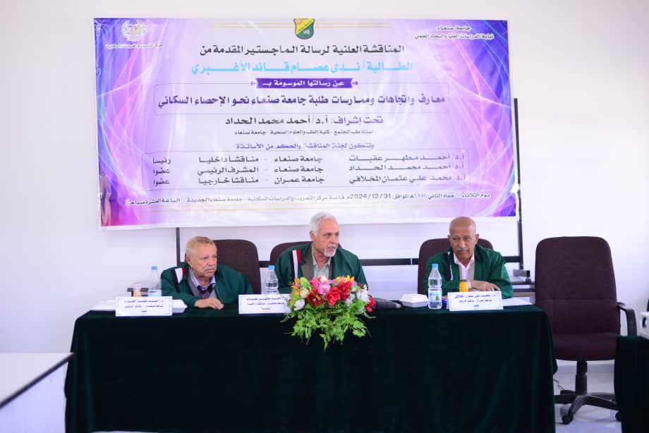 نالت الطالبة ندى عصام قايد عبدالحق الأغبري، درجة الماجستير في الدراسات السكانية، تخصص دراسات سكانية، مركز التدريب والدراسات السكانية بجامعة صنعاء، عن رسالته الموسومة بـ” معارف واتجاهات وممارسات طلبة جامعة صنعاء نحو الاحصاء السكاني “، يوم الثلاثاء 1/7/1446هـ، الموافق 31/12/2024 م.
