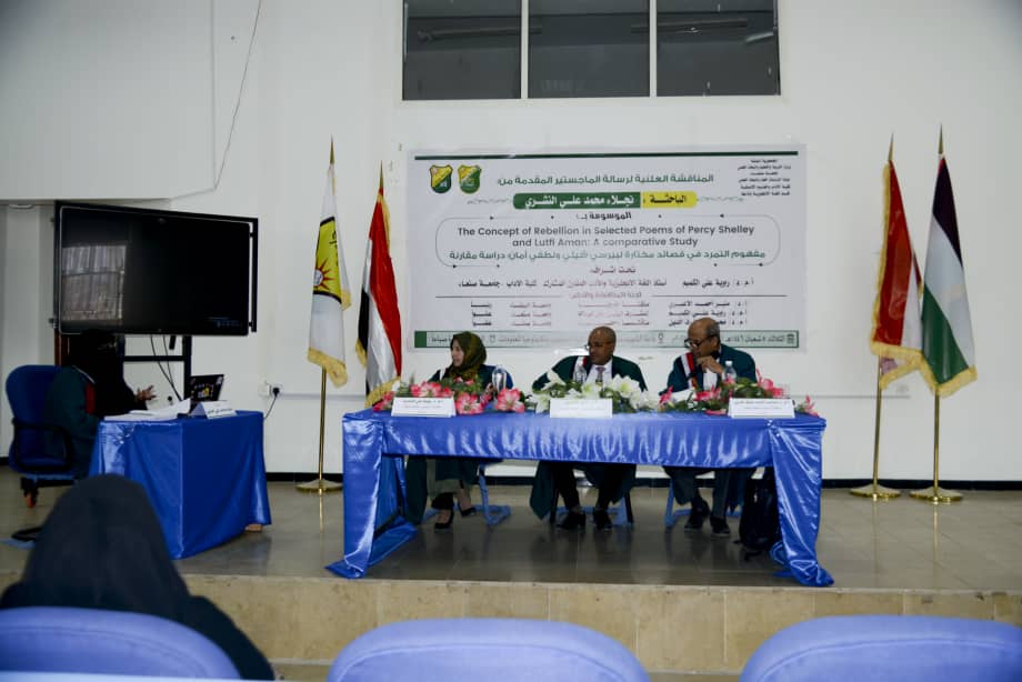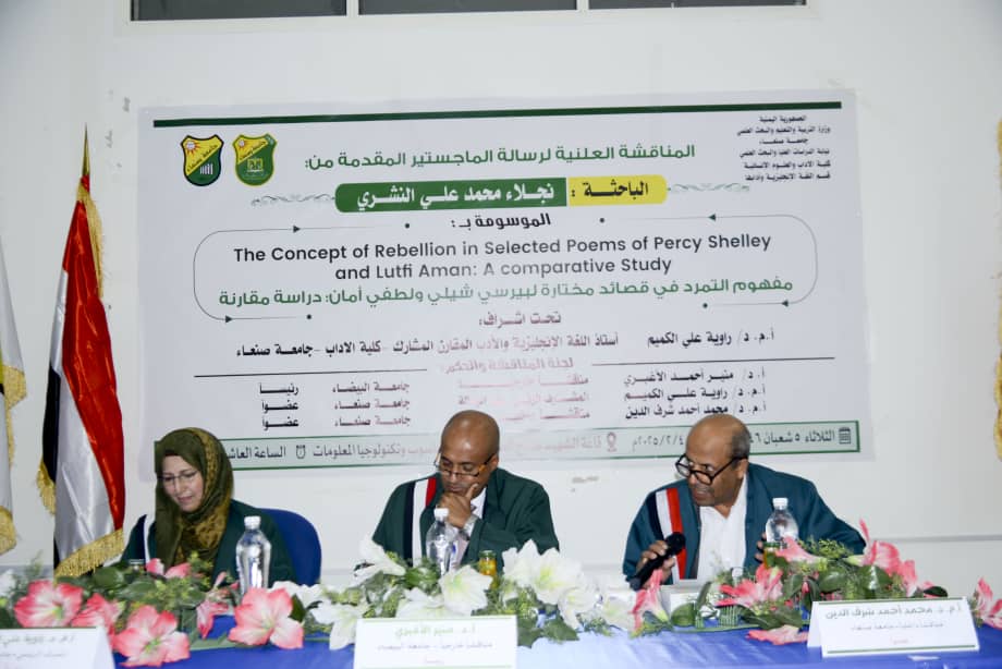 نالت الباحثة نجلاء محمد علي النشري، درجة الماجستير بدرجة 95 وبتقدير ممتاز من قسم (اللغة الإنجليزية وآدابها) تخصص (أدب مقارن) من كلية (الآداب والعلوم الإنسانية) بجامعة صنعاء، عن رسالتها الموسومة بـ”(مفهوم التمرد في قصائد مختارة لبيرسي شيلي ولطفي أمان: دراسة مقارنة)