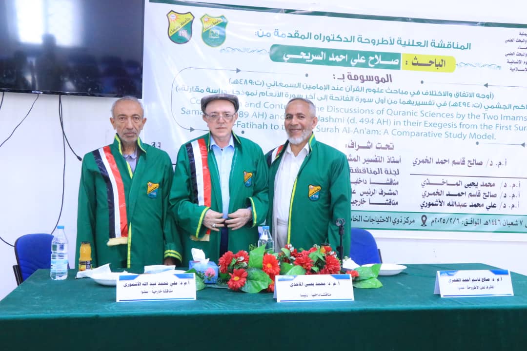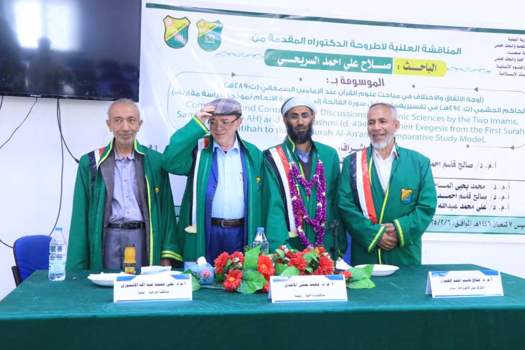نال الباحث صلاح علي أحمد السريحي، درجة الدكتوراة في قسم الدراسات الإسلامية ” تخصص تفسير ” من كلية الآداب والعلوم الإنسانية بجامعة صنعاء ، عن أطروحته الموسومة ب : أوجه الاتفاق والاختلاف في مباحث علوم القرآن عند الإمامين السمعاني ( ت : 489 هجرية ) والحاكم الجشمي ( ت : 494 هجرية ) في تفسيريهما من أول سورة الفاتحة إلى آخر سورة الأنعام نموذجا ” دراسة مقارنة ” يوم الخميس 7 شعبان 1446 الموافق 6 فبراير 2025 م .