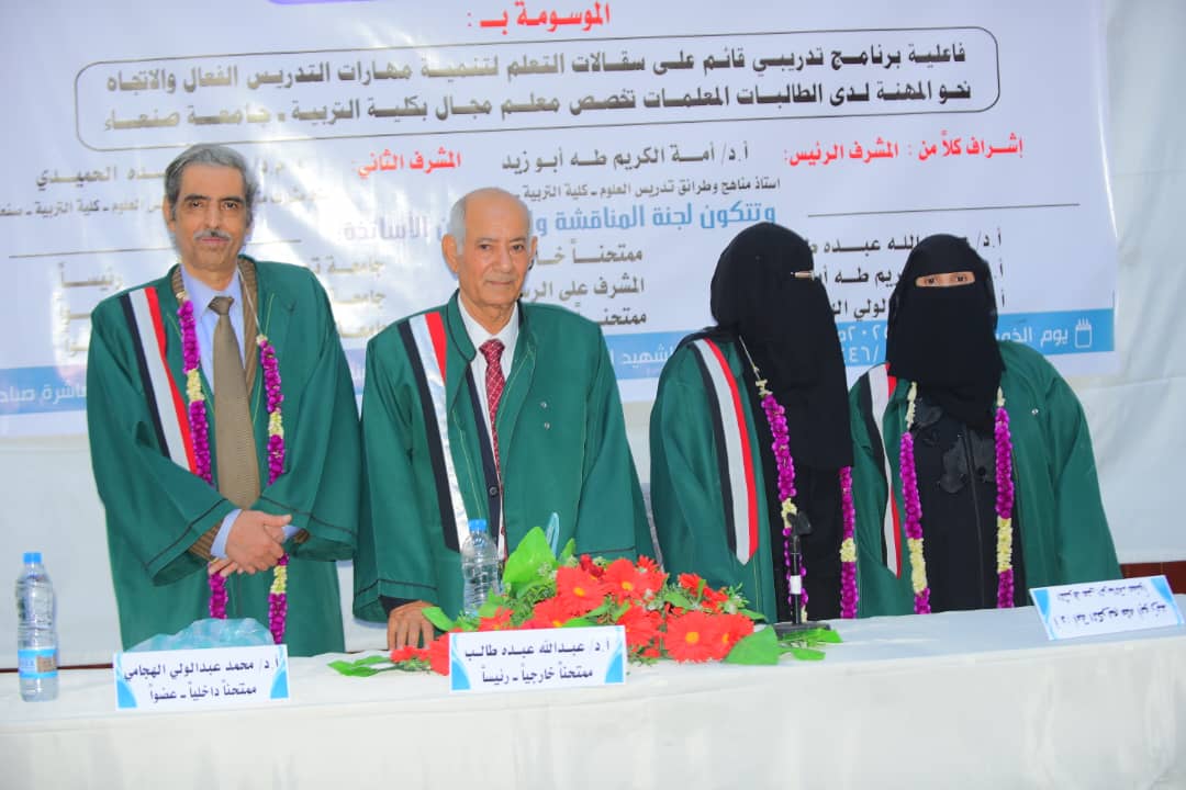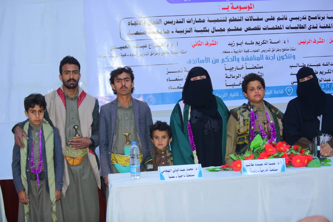 نالت الباحثة هاجر علي محمد حمود القفري، درجة الدكتوراة من قسم مناهج العلوم وطرائق تدريسها بكلية التربيةـ جامعة صنعاءـ عن أطروحتها الموسومة بـ (فاعلية برنامج تدريبي قائم على سقالات التعلم لتنمية مهارات التدريس الفعال والاتجاه نحو المهنة لدى الطالبات المعلمات تخصص معلم مجال بكلية التربية ـ جامعة صنعاء) يوم الخميس 7/شعبان/1446 هـ الموافق 6ـ2ـ2025م.