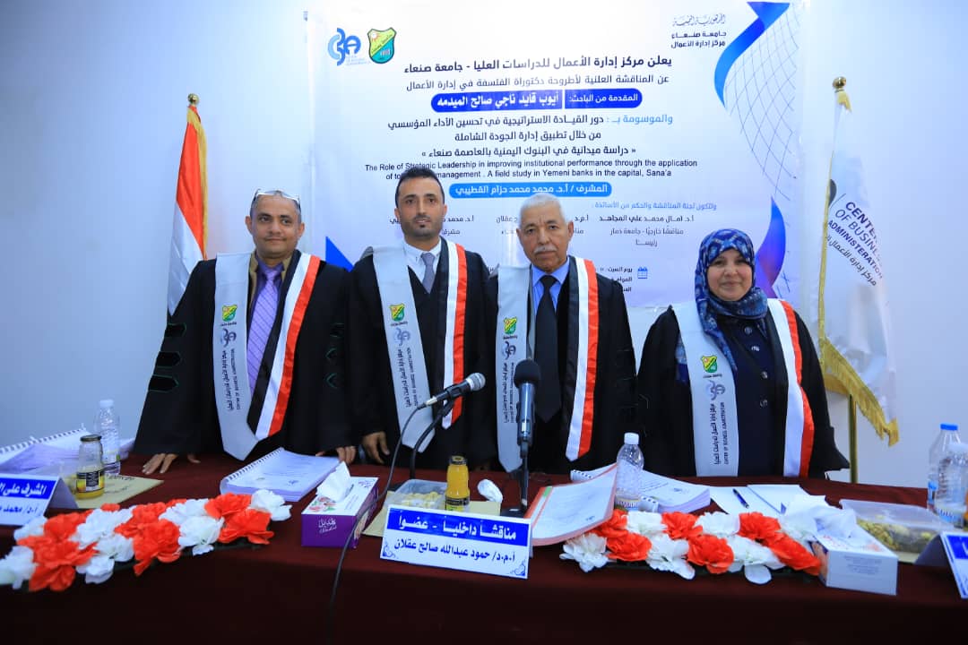 نال الباحث أيوب قايد ناجي صالح الميدمه درجة الدكتوراة في فلسفة إدارة الأعمال PHD، من مركز إدارة الأعمال للدراسات العليا CBA، بجامعة صنعاء عن أطروحته الموسومة بــــــ ” دور القيادة الاستراتيجية في تحسين الأداء المؤسسي من خلال تطبيق إدارة الجودة الشاملة:دراسة ميدانية في البنوك اليمنية بالعاصمة صنعاء”يوم السبت 11/ 7/ 1446 الموافق 11/1/2025 .