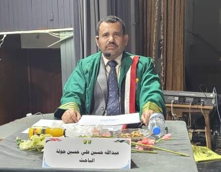 نال الباحث / عبد الله حسين علي حسين جولة درجة الدكتوراة قسم (علم النفس) تخصص (علم النفس الشخصية) من كلية (الآداب والعلوم الإنسانية) بجامعة صنعاء عن أطروحته الموسومة بـ: (سمات الشخصية وعلاقتها بسلوك المخاطرة ومفهوم الذات لدى ضباط الشرطة اليمنية – دراسة ميدانية في أمانة العاصمة صنعاء).