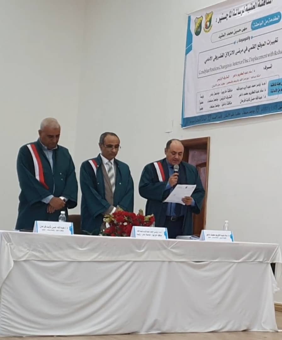 وتكونت لجنة المناقشة والحكم من الأستاذ المساعد الدكتور ( سام عبدالكريم محمد داعر) مشرفا رئيساً وعضو اللجنة والأستاذ المساعد الدكتور (عبدالله حسن ثابت فرحان) مناقشاً داخلياً وعضواً في اللجنة والأستاذ المشارك الدكتور (ياسر أحمد عبدالرب عبدالله) مناقشاً خارجياً و رئيساً للجنة.