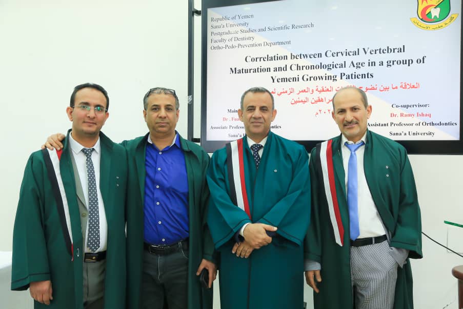 نال الباحث عبدالملك عبدالرحمن عبدالواحدالصبري درجة الماجستير بتقدير ممتاز في قسم تقويم الأسنان وطب أسنان الأطفال والطب الوقائي بكلية طب الأسنان بجامعة صنعاء عن رسالته الموسومة ب( العلاقة بين نضوج الفقرات العنقية والعمر الزمني لمجموعة من اليافعين اليمنين) يوم الثلاثاء ١٤ رجب ١٤٤٦ه الموافق ٢٠٢٥/١/١٤ م