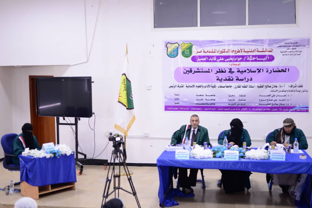 نالت الباحثة حواء يحيى علي العمير ،درجة الدكتوراة من قسم ( الدراسات الإسلامية ) تخصص ( فكر إسلامي ) من كلية ( الآداب والعلوم الإنسانية ) بجامعة صنعاء عن أطروحتها الموسومة بـ ( الحضارة الإسلامية في نظر المستشرقين_ دراسة نقدية) يوم الأربعاء 13 شعبان 1446هـ الموافق 12 فبراير 2025م.