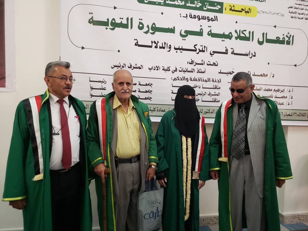 نالت الباحثة حنان خالد محمد يعيش درجة الماجستير بدرجة 95 %وبتقدير ممتاز مع التوصية بالطباعة وتداول الرسالة في الجامعات، من قسم اللغة العربية وآدابها تخصص لسانيات من كلية الآداب والعلوم الإنسانية بجامعة صنعاء، عن رسالتها الموسومة بـ”الأفعال الكلامية في سورة التوبة – دراسة في التركيب والدلالة”.وذلك يوم الثلاثاء 26 شعبان عام 1446هـ الموافق 25 فبراير 2025م.