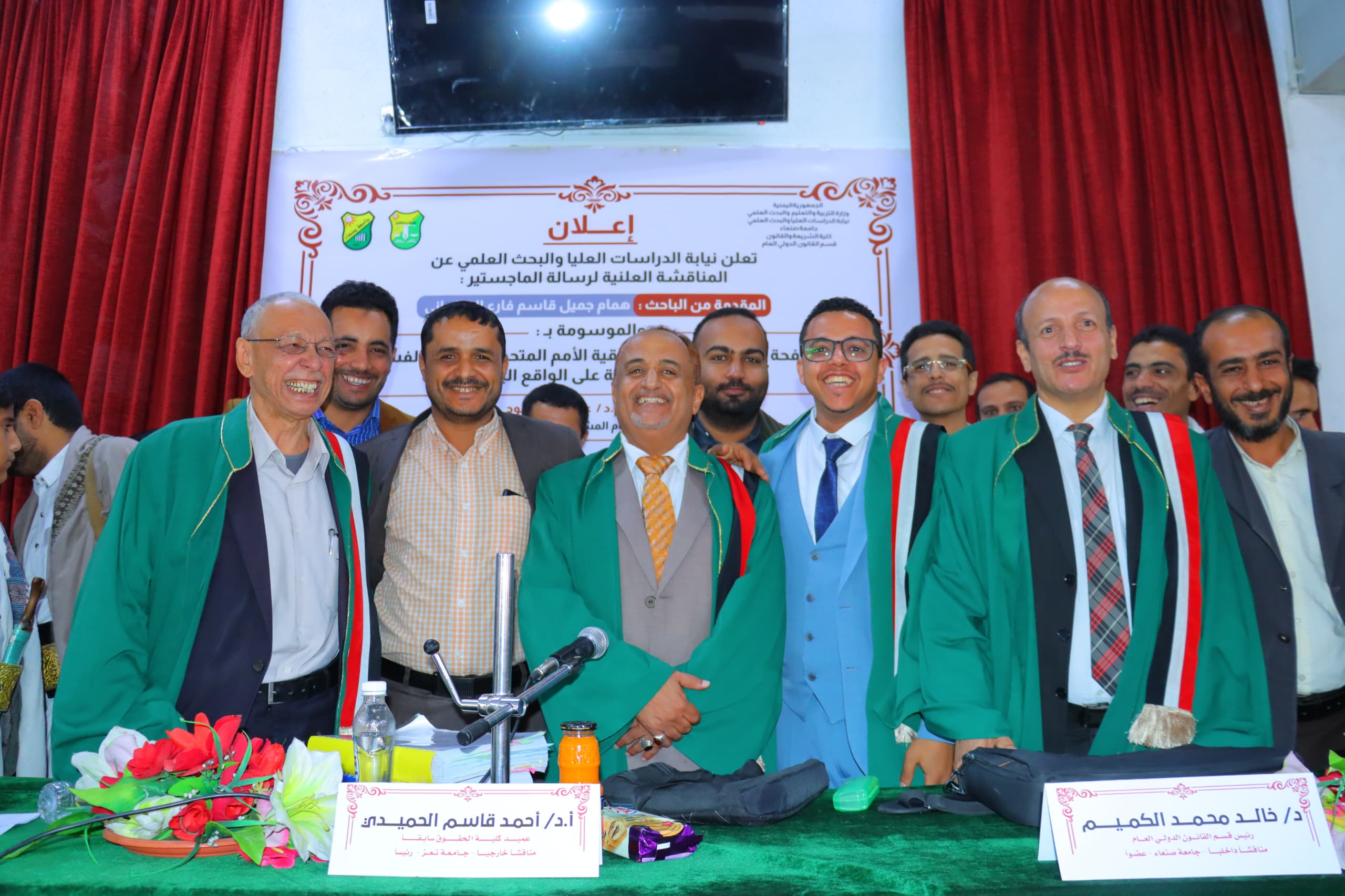 وتكونت لجنة المناقشة والحكم من الأساتذة: أ.د / أحمد قاسم الحميدي مناقشاً خارجياً – جامعة تعز رئيساً، أ.م.د / علي ناجي الأعوج المشرف الرئيس – جامعة صنعاء عضواً، د / خالد محمد الكميم مناقشاً داخلياً – جامعة صنعاء عضواً.