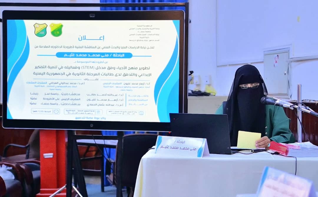 نالت الباحثة منى محمد محمد غُثيم، درجة الدكتوراه من قسم مناهج العلوم وطرائق تدريسها بكلية التربية- جامعة صنعاء- عن أطروحتها الموسومة بـ (تطوير منهج الأحياء وفق مدخل (STEM) وفاعليته في تنمية التفكير الإبداعي والتدفق لدى طالبات المرحلة الثانوية في الجمهورية اليمنية) يوم الخميس 21 شعبان 1446 هـ الموافق 20/ 2/ 2025م.