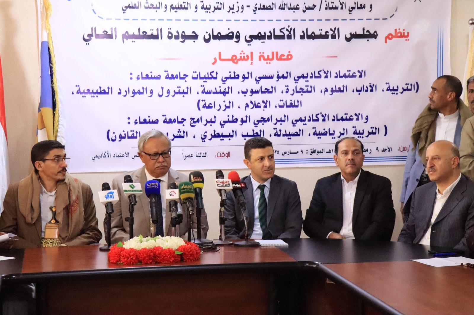 جاء ذلك في فعالية إشهار الاعتماد الأكاديمي المؤسسي الوطني، امس، في صنعاء لكليات جامعة صنعاء (التربية، الآداب، العلوم، التجارة، الحاسوب، الهندسة، البترول والموارد الطبيعية، اللغات، الإعلام والزراعة)، والاعتماد الأكاديمي الوطني لبرامج جامعة صنعاء (التربية الرياضية، الصيدلة، الطب البيطري والشريعة والقانون). وسبق ان حصلت الجامعة على الاعتماد الاكاديمي الذهبي لبرنامج الجراحة العامة بكلية الطب والعلوم الصحية والاعتماد الاكاديمي الذهبي لبرنامج طب جراحة الفم والاسنان بكلية الاسنان .