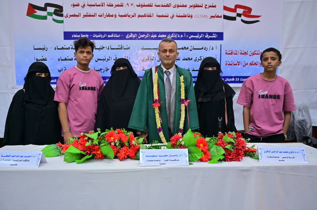نال الباحث/ يحيى فتيني كداف جله درجة الدكتوراه من قسم الرياضيات بكلية التربية جامعة صنعاء عن أطروحته الموسومة “مُقترح لتطوير محتوى الهندسة للصفوف (7- 9) للمرحلة الأساسية في ضوء معايير (CCSSM) وفاعليته في تنمية المفاهيم الرياضية ومهارات التفكير البصري” يوم السبت 23 من شهر شعبان لسنه 1446هـ الموافق 22/2/2025م