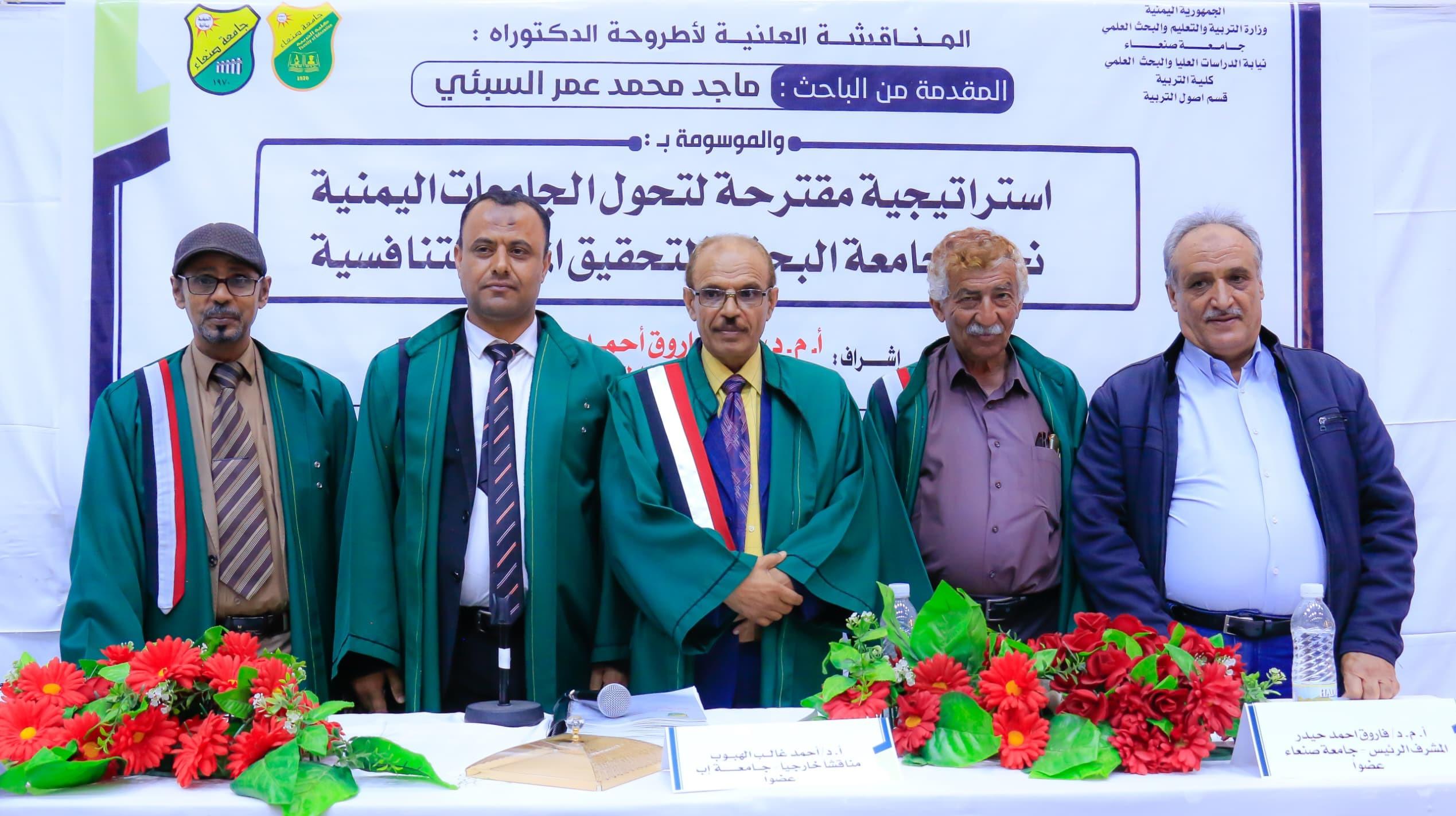 نال الباحث / ماجد محمد عمرالسبئي، درجة الدكتوراه من قسم: أصول التربية، بكلية التربية صنعاء ،تخصص: تخطيط تربوي، عن أطروحته الموسومة بـ “استراتيجية مقترحة لتحول الجامعات اليمنية نحو الجامعة البحثية لتحقيق الميزة التنافسية ” يوم الاربعا27 من شهر شعبان 1446هـ الموافق 26/2/2025م