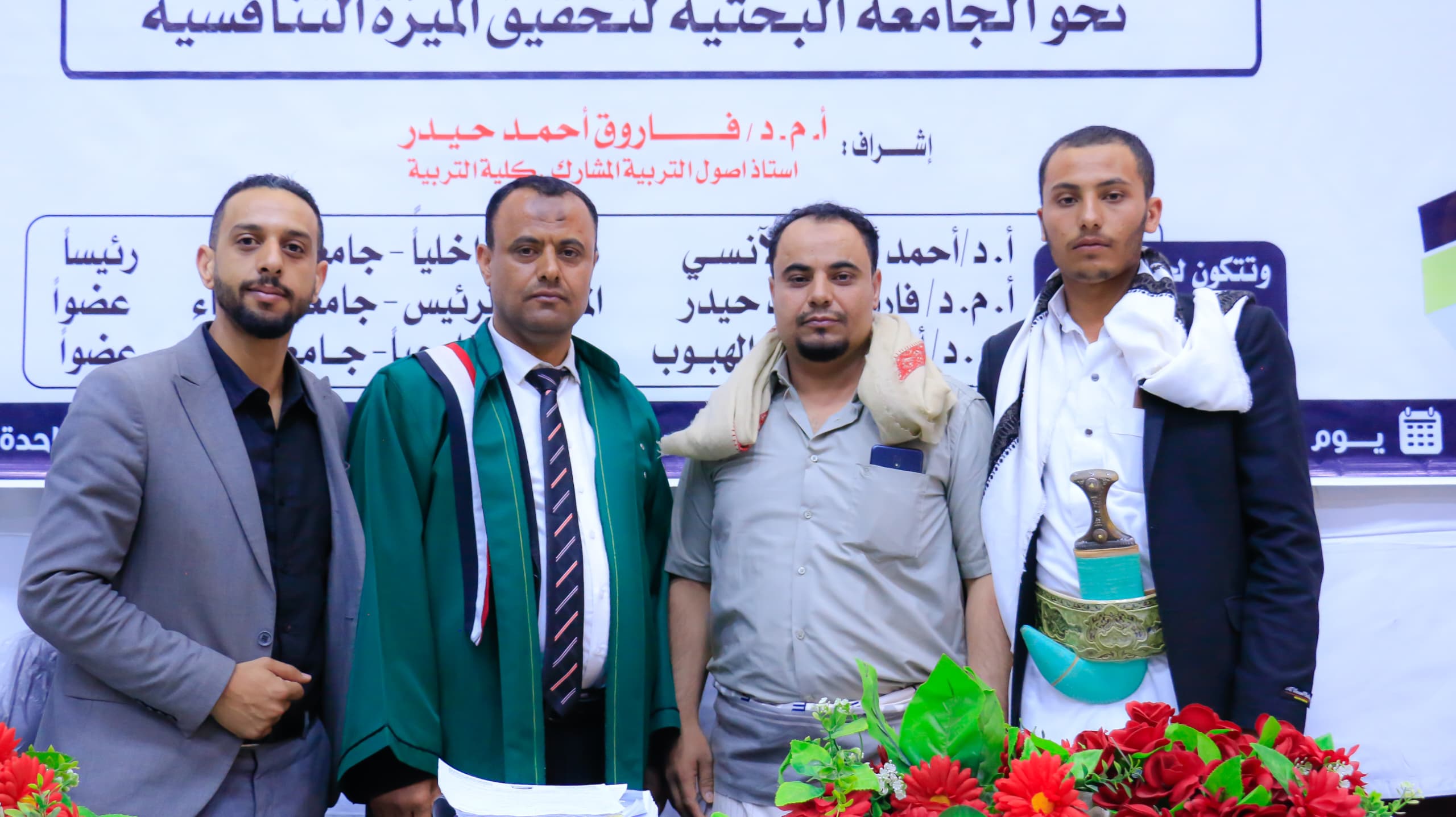 الأستاذ الدكتور/ أحمد أحمد الانسي رئيساً للجنة ومناقشاً داخلياً جامعة صنعاء، و الأستاذ المشارك الدكتور / أحمد غالب الهبوب أستاذ أصول التربية في جامعة إب،عضوا ومناقشاً خارجياً ،و الأستاذ المشارك الدكتور/فاروق أحمد حيدر المشرف الرئيس وعضواً باللجنة، جامعة صنعاء.