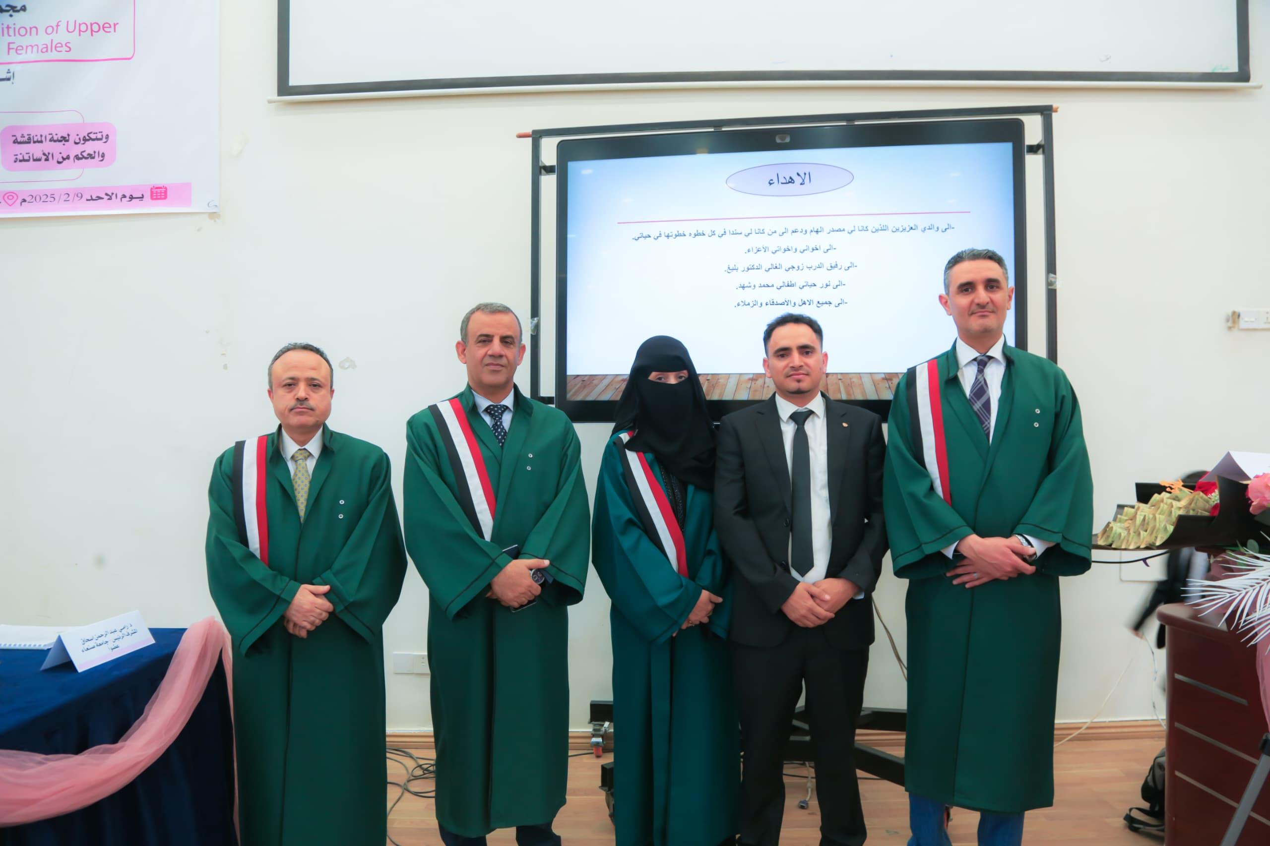 وتكونت لجنة المناقشة والحكم من الأستاذ الدكتور (رامي عبدالرحمن اسحاق) مشرفا رئيسا وعضوا للجنة والأستاذ الدكتور (فؤاد لطف المترب) مناقشا داخليا ورئيسا للجنة والأستاذ المشارك(خالد أحمد علي الضرعي) مناقشا خارجيا عضو اللجنة.