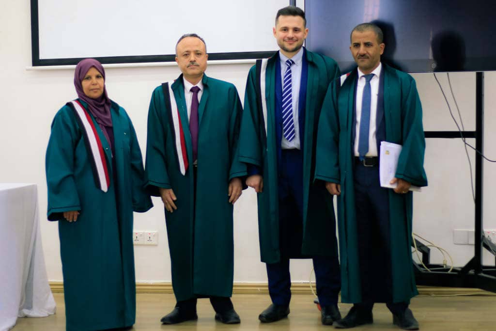 وتكونت لجنة المناقشة والحكم من الأستاذ الدكتور (عبدالقادر زبارة) مشرفا رئيسا وعضوا للجنة والأستاذ الدكتور (نائلة المجاهد) مناقشا داخليا ورئيسا للجنة والأستاذ المشارك(خالد الضرعي) مناقشا خارجيا عضو اللجنة .