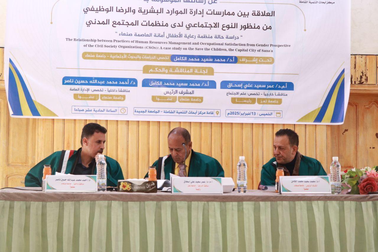 نالت الباحثة أميرة نصرالدين أحمد الحداء درجة الماجستير بتقدير ممتاز تخصص دراسات في التنمية الدولية من مركز أبحاث التنمية الشاملة بجامعة صنعاء، عن رسالتها الموسومة بـ”العلاقة بين ممارسات إدارة الموارد البشرية والرضا الوظيفي من منظور النوع الاجتماعي لدى منظمات المجتمع المدني دراسة حالة منظمة رعاية الأطفال أمانة العاصمة صنعاء ” وذلك يوم الخميس ١٤٤٦/٨/١٥هـ، الموافق ١٣/فبراير/2025م.