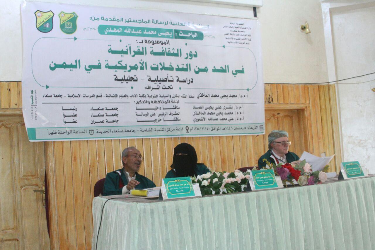 نال الباحث يحيى محمد عبدالله قاسم المهدي درجة الماجستير بدرجة 95 %وبتقدير ممتاز مع التوصية بالطباعة وتداول الرسالة في الجامعات، من قسم الدراسات الإسلامية تخصص فكر إسلامي من كلية الآداب والعلوم الإنسانية بجامعة صنعاء، عن رسالته الموسومة ب ” دور الث.قافةالقرآنيةفي الحد من التدخلات الأمريكية في اليمن”.وذلك يوم الأربعاء ٥ رمضان 1446 هجرية الموافق 5 مارس 2025م.