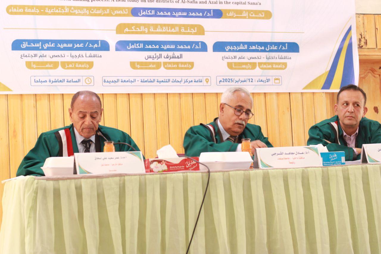 وتكوّنت لجنة المناقشة والحكم من: ا.د عادل مجاهد الشرجبي مناقشًا خارجيًا و رئيساً للجنة، و ا.د. محمد سعيد الكامل مشرفًا رئيس وعضوًا، وا.د عمر سعيد علي إسحاق مناقشًا داخليًا و عضواً.