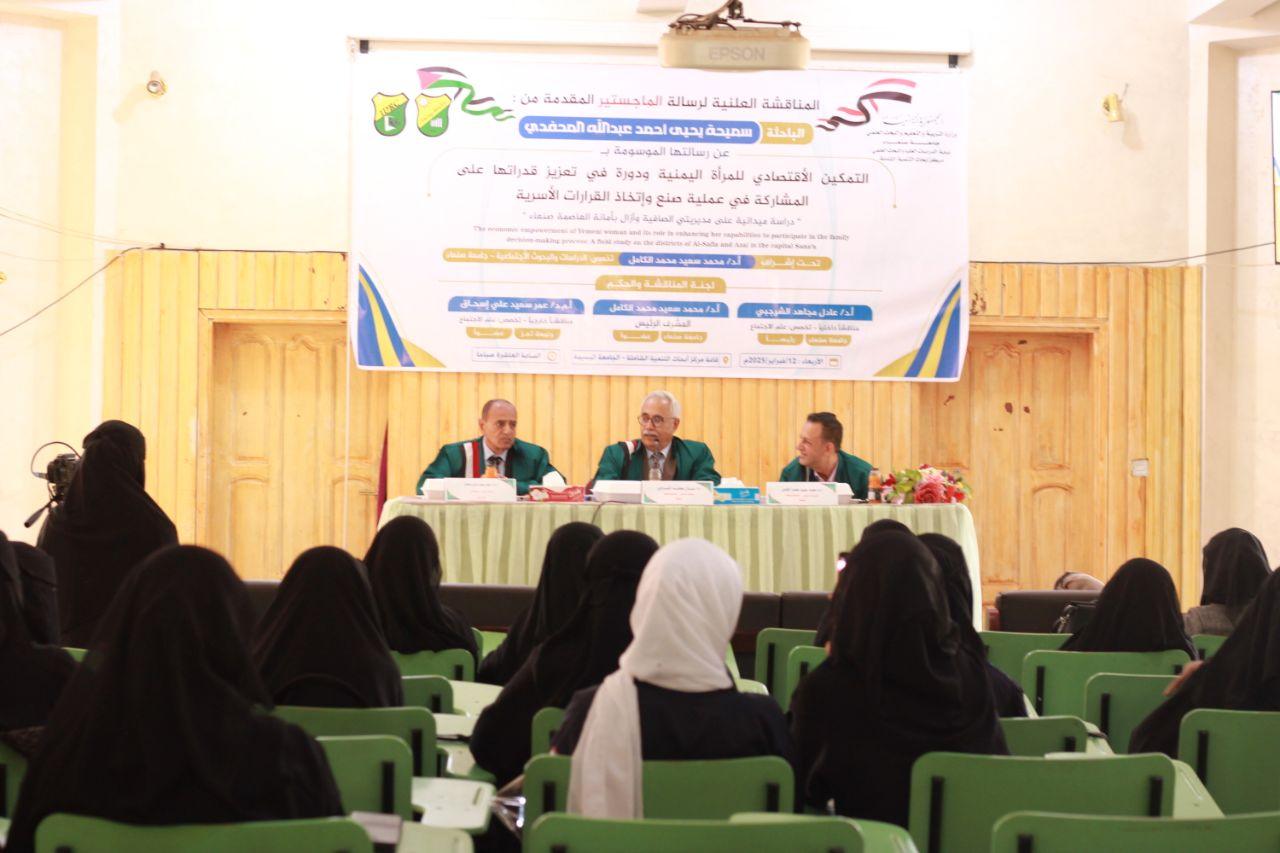 نالت الباحثة سميحة يحيى أحمد المحفدي درجة الماجستير بتقدير ممتاز تخصص دراسات في التنمية الدولية من مركز أبحاث التنمية الشاملة بجامعة صنعاء، عن رسالتها الموسومة بـ”دور التمكين الاقتصادي للمرأة اليمنية ودوره في تعزيز قدراتها على المشاركة في عملية صنع واتخاذ القرارات الأسرية: دراسة ميدانية على مديريتي الصافية وآزال بأمانة العاصمة – صنعاء ” وذلك يوم الاربعاء ١٤٤٦/٨/١٤هـ، الموافق ١٢/فبراير/2025م.
