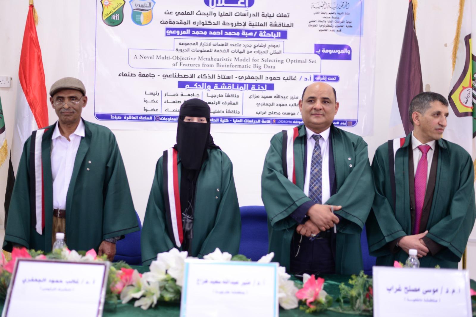نالت الباحثة /هبة محمد أحمد المروعي درجة الدكتوراه في الحوسبة وعلم المعلومات قسم (علوم الحاسوب) تخصص (علوم حاسوب) كلية (الحاسوب وتكنولوجيا المعلومات) بجامعة صنعاء عن اطروحتها الموسومة بــــــ