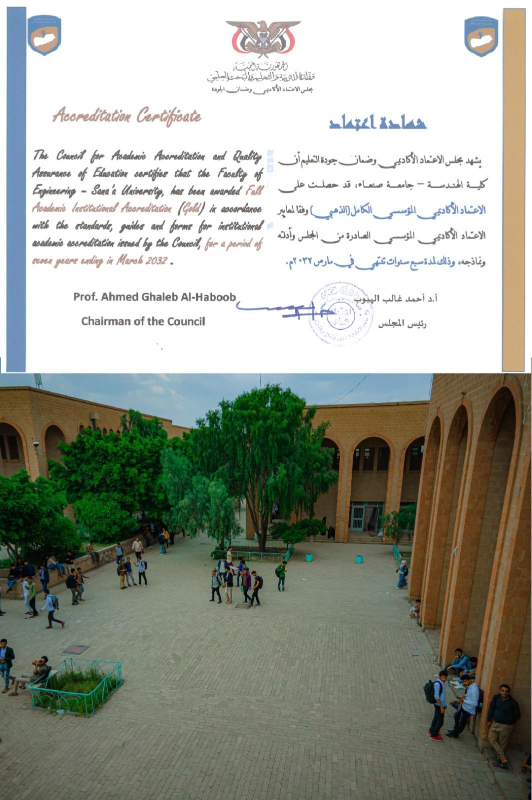 شهادة الاعتماد الأكاديمي المؤسسي لكلية الهندسة – جامعة صنعاء لحصولها على الاعتماد الأكاديمي المؤسسي الكامل (الذهبي) وفقاً لمعايير الاعتماد الأكاديمي المؤسسي الصادرة من مجلس الاعتماد الأكاديمي.