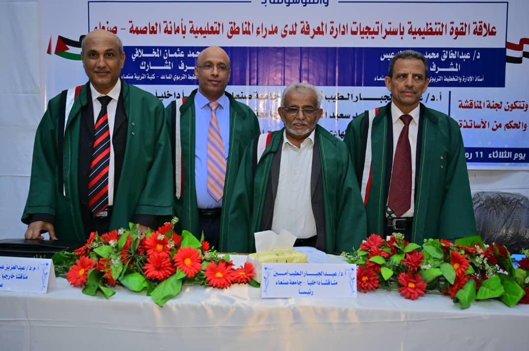 نال الباحث يوسف قايد ناجي سلطان درجة الماجستير بتقدير إمتياز ونسبة 95 % في قسم (الإدارة والتخطيط التربوي) تخصص (إدارة وتخطيط تربوي) كلية (التربية) بجامعة صنعاء عن رسالته الموسومة بــــــ “علاقة القوة التنظيمية باستراتيجيات إدارة المعرفة لدى مدراء المناطق التعليمية بأمانة العاصمة صنعاء” يوم الثلاثاء 11/09/1446هـ الموافق 11/03/2025م .