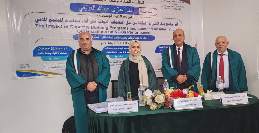 نالت الباحثة منى غازي عبد الله العريقي درجة الماجستير بتقدير ممتاز تخصص دراسات في التنمية الدولية باللغة الإنجليزية من مركز أبحاث التنمية الشاملة بجامعة صنعاء، عن رسالتها الموسومة بـ”أثر برامج بناء القدرات المقدمة من المنظمات الدولية على أداء منظمات المجتمع المدني ” وذلك يوم الاثنين ٢٦/ ٨ / ١٤٤٦هـ، الموافق ٢٤/فبراير/2025م.