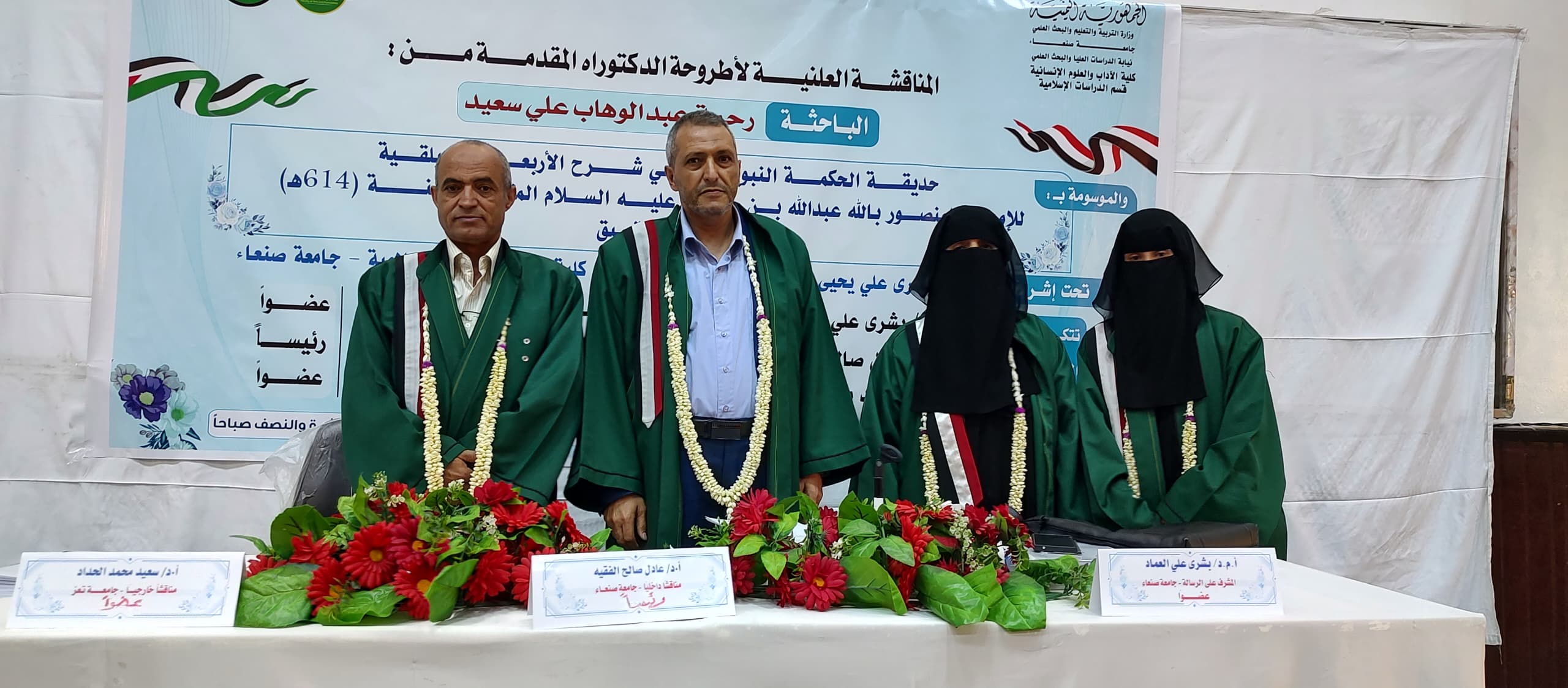 نالت الباحثة رحمة عبد الوهاب علي سعيد درجة الدكتوراه من قسم (الدراسات الإسلامية) تخصص (حديث) من كلية(الآداب و العلوم الإنسانية) بجامعة صنعاء عن أطروحتها الموسومة ب ( حديقةالحكمةالنبويةفي شرح الأربعين السيلقية للإمام المنصور بالله عبدالله بن حمزةعليه السلام المتوفى (٦١٤ه) دراسة وتحقيق وذلك يوم الإثنين ١٧ رمضان1446ه الموافق ١٧ مارس 2025م.