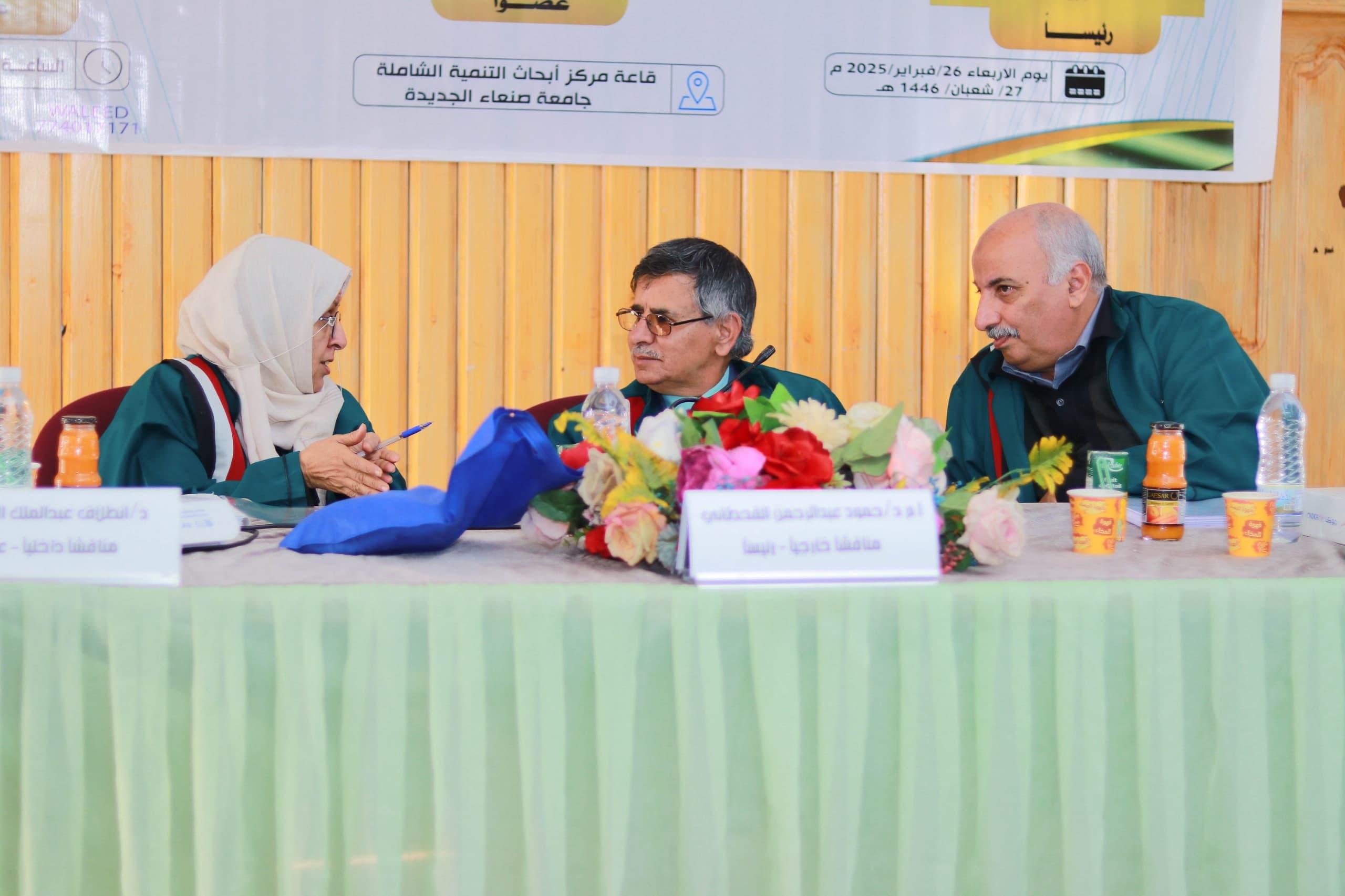 وتكوّنت لجنة المناقشة والحكم من: ا.م.د حمود عبدالرحمن القحطاني مناقشًا خارجياً و رئيساً للجنة، و ا.م.د عبدالوهاب يحيى عبدالقادر مشرفا رئيسا وعضوًا، و د. إنطلاق عبدالملك المتوكل مناقشاً داخلياً و عضواً.