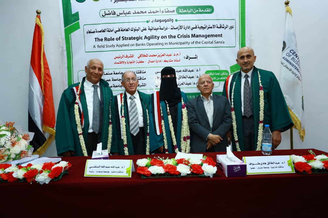 نالت الباحثة صفاء أحمد محمد عباس فاضل درجة الماجستير في قسم إدارة الأعمال بتقدير عام (ممتاز) بنسبة (95%) من كلية التجارة والاقتصاد بجامعة صنعاء، عن رسالتها الموسومة بـ “دور الرشاقة الاستراتيجية في إدارة الأزمات – دراسة ميدانية على البنوك العاملة في أمانة العاصمة صنعاء”.