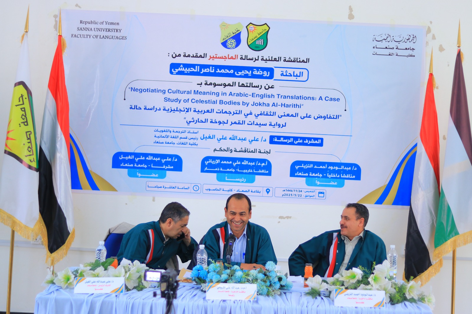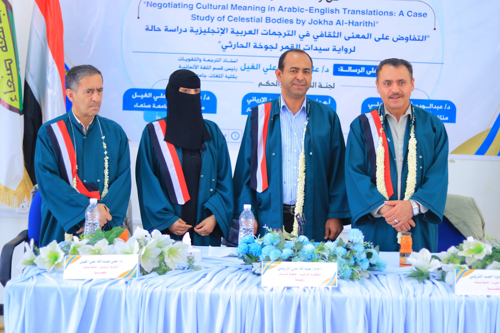 نالت الباحثة روضة يحيى محمد ناصر الحبيشي درجة الماجستير بدرجة 95% بتقدير ممتاز في قسم اللغة الإنجليزية – تخصص لغويات – كلية اللغات بجامعة صنعاء عن رسالتها الموسومة بـ: “التفاوض على المعنى الثقافي في الترجمات العربية-الإنجليزية: دراسة حالة لرواية سيدات القمر لجوخة الحارثي” يوم الخميس، 24 ذي القعدة، 1446هـ الموافق22/05/2025م.