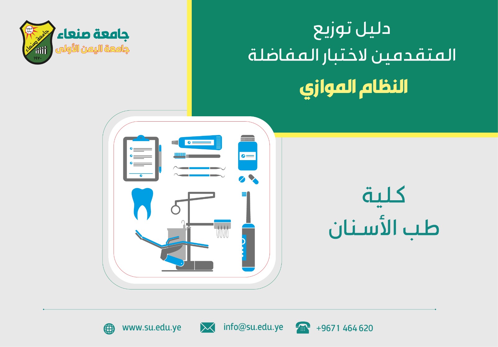 أعلنت نيابة شؤون الطلاب بجامعة صنعاء عن تحديد يوم الجمعة الموافق 30 مايو 2025م موعدًا لإجراء اختبار المفاضلة للطلاب المتقدمين للتسجيل في كلية طب الأسنان – (النظام الموازي)، وذلك ضمن إجراءات القبول والتنسيق للعام الجامعي 2025/2026م.